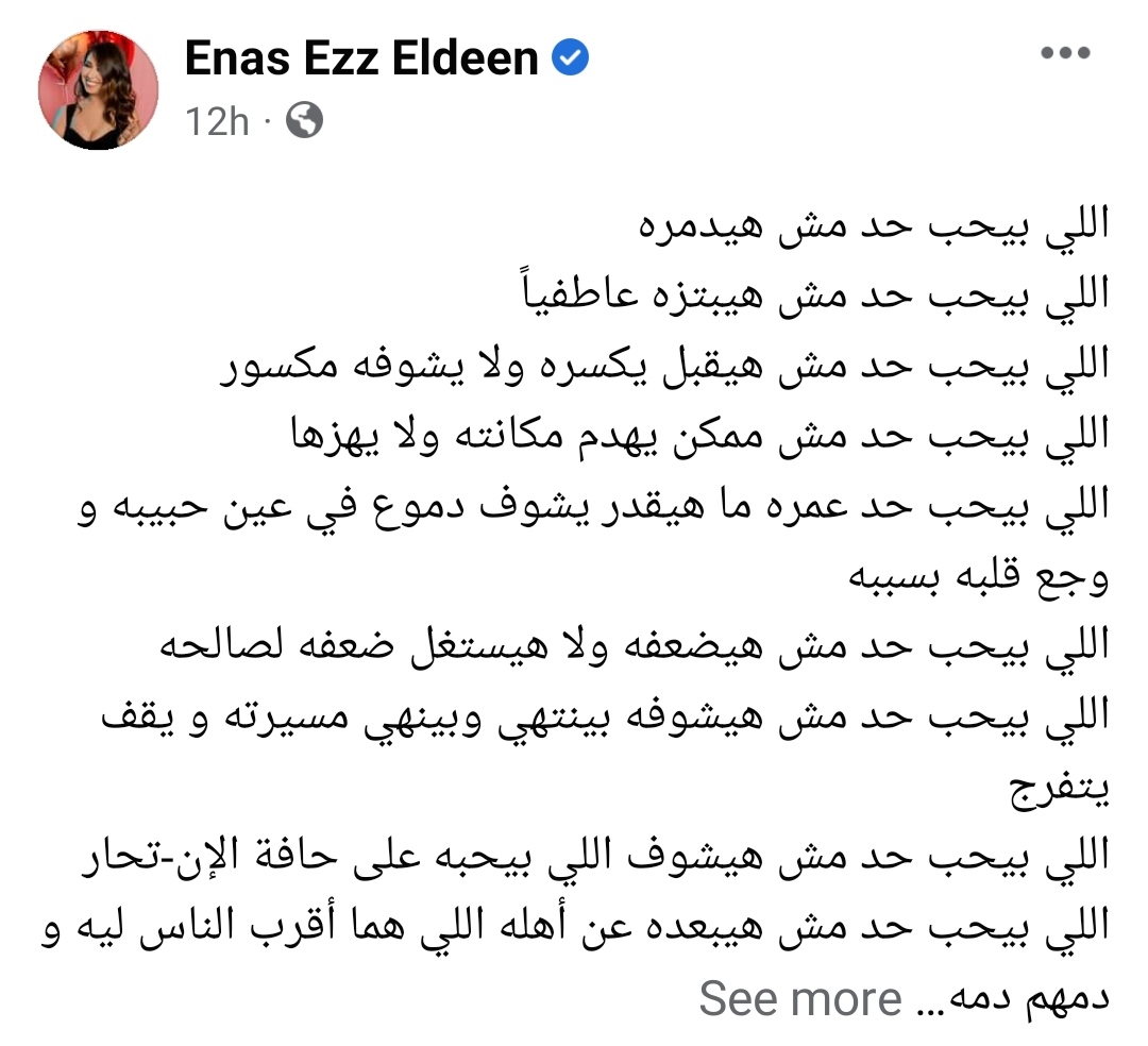 وقامت إيناس عز الدين بنشر تعليق أخر تظهر أفعال الشخص مع الشخص الذي يحبه :" اللي بيحب حد مش هيدمره اللي بيحب حد مش هيبتزه عاطفياً اللي بيحب حد مش هيقبل يكسره ولا يشوفه مكسور اللي بيحب حد مش ممكن يهدم مكانته ولا يهزها اللي بيحب حد عمره ما هيقدر يشوف دموع في عين حبيبه و وجع قلبه بسببه".