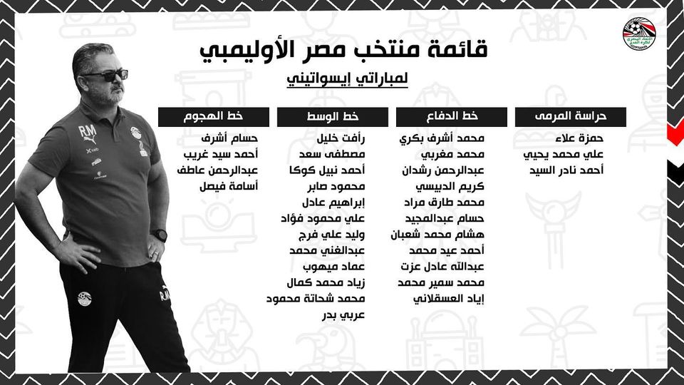 وتضم قائمة المنتخب الأولمبي لمباراتي إيسواتيني، كلا من: حراسة المرمى: علي محمد يحيى، حمزة علاء، أحمد نادر السيد، خط الدفاع: محمد أشرف بكري، محمد مغربي، عبد الرحمن رشدان، كريم الدبيس، محمد طارق مراد، حسام عبد المجيد، هشام محمد شعبان، أحمد عيد، عبد الله عادل، محمد سمير، إياد العسقلاني، خط الوسط: رأفت خليل، مصطفى سعد، أحمد نبيل كوكا، محمود صابر، إبراهيم عادل، علي محمود فؤاد، وليد علي فرج، عبد الغني محمد، عماد ميهوب، زياد محمد كمال، محمد شحاتة، عربي بدر، خط الهجوم: حسام أشرف، أحمد سيد غريب، عبد الرحمن عاطف، أسامة فيصل.