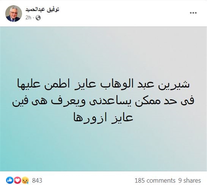 وتحدث توفيق عبد الحميد عبر حسابه على عبر فيس بوك، حول شعوره بالقلق تجاه حالة شيرين عبد الوهاب وطلب مساعدة الآخرين لرؤيتها.