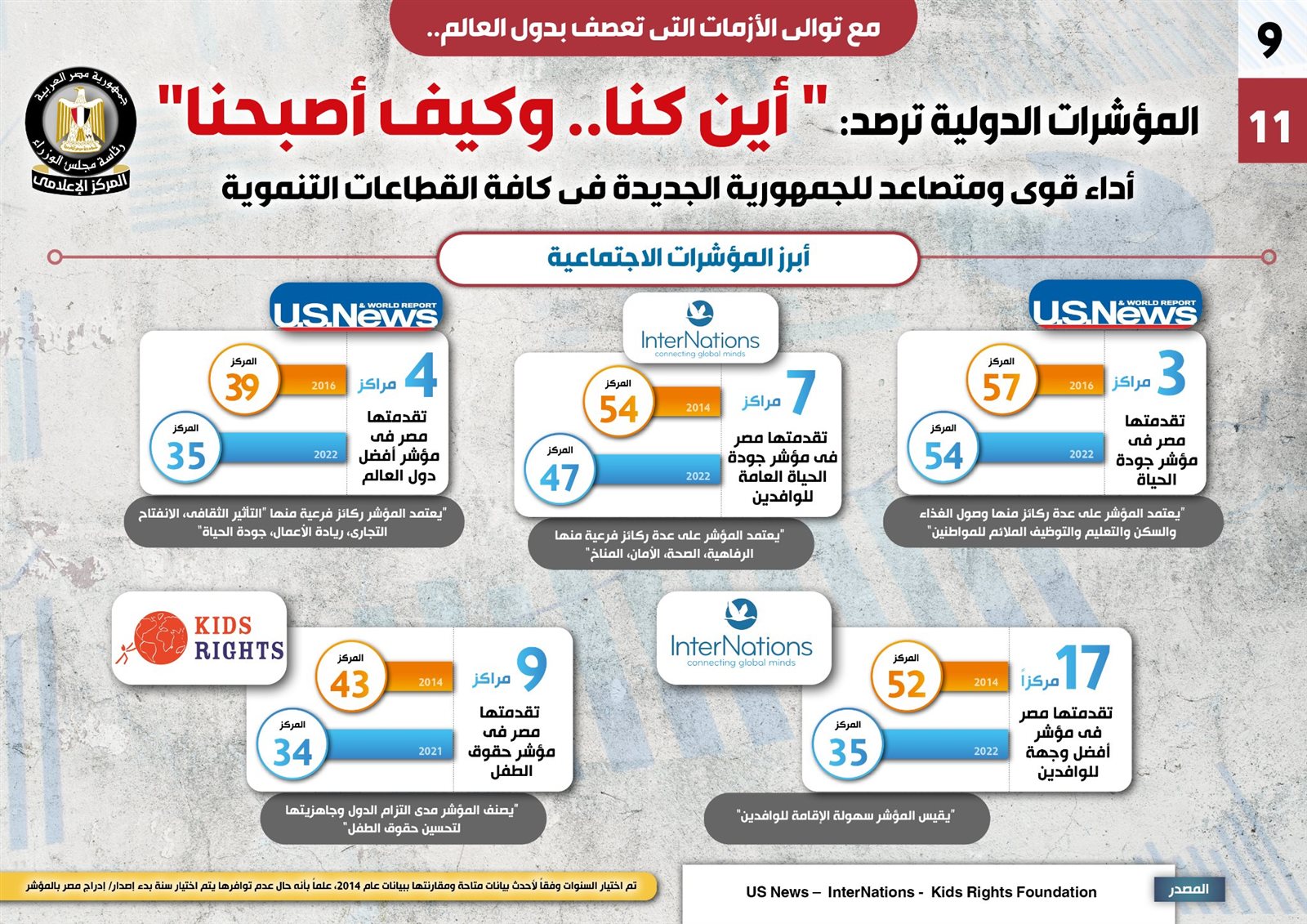 وإلى جانب ما سبق فقد تقدمت مصر 17 مركزاً في مؤشر أفضل وجهة للوافدين الصادر عن InterNations، والذي يقيس سهولة الإقامة للوافدين، حيث شغلت المركز 35 عام 2022، مقابل المركز 52 عام 2014، بالإضافة إلى تقدمها 9 مراكز بمؤشر حقوق الطفل الصادر عن Kids Rights Foundationالذي يصنف مدى التزام الدول وجاهزيتها لتحسين حقوق الطفل، حيث احتلت المركز 34 عام 2022، مقابل المركز 43 عام 2014.