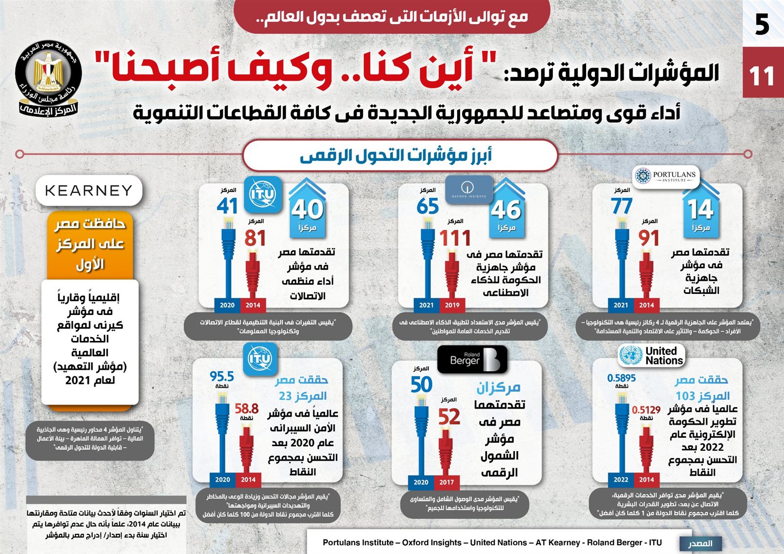 وتتضمن مؤشرات التحول الرقمي كذلك، تحقيق مصر المركز 103 عالمياً في مؤشر تطوير الحكومة الإلكترونية عام 2022 بعد التحسن بمجموع النقاط، حيث يقيس المؤشر الصادر عن الأمم المتحدة، مدى توافر الخدمات الرقمية، والاتصال عن بعد، وتطوير القدرات البشرية، لتسجل 0.5895 نقطة عام 2022 مقابل 0.5129 عام 2014، علماً بأنه كلما اقترب مجموع النقاط من 1 كلما كان أفضل.