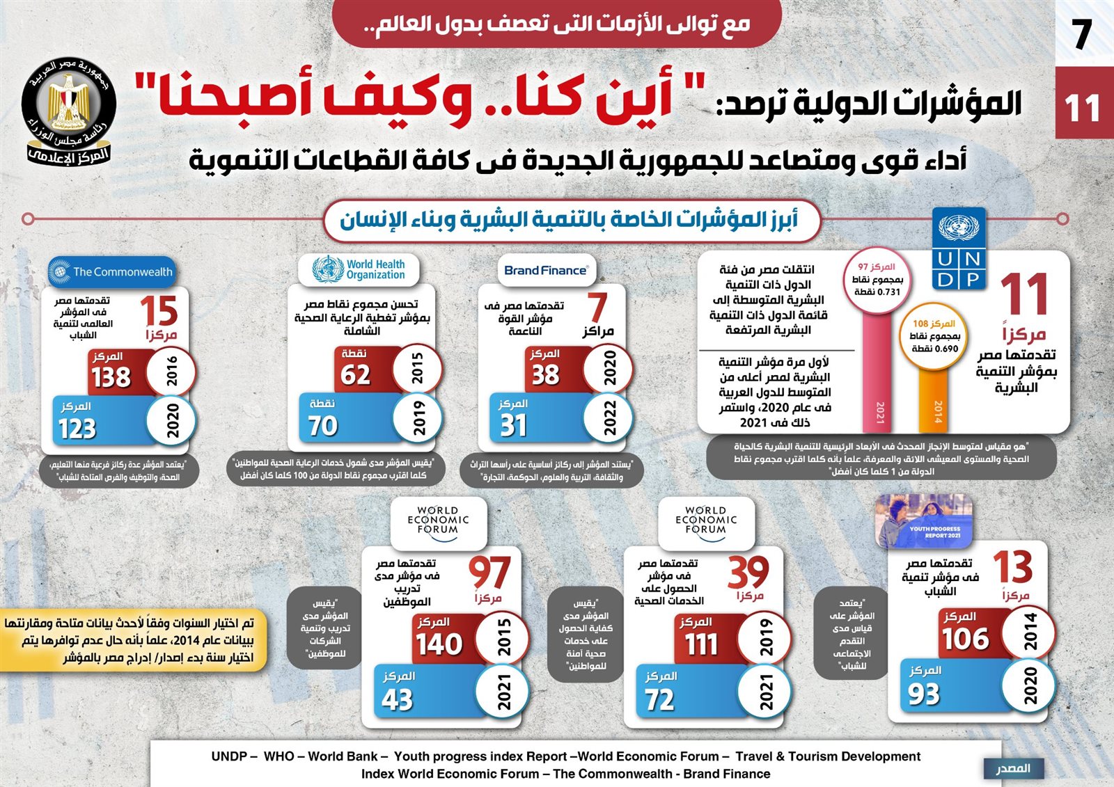 وبشأن مؤشر تنمية الشباب الصادر عن Youth Progress Index Report، فقد تقدمت مصر 13 مركزاً حيث شغلت المركز 93 عام 2020، مقابل المركز 106 عام 2014، علماً بأن المؤشر يعتمد على قياس مدى التقدم الاجتماعي للشباب، بجانب تقدم مصر 39 مركزاً في مؤشر الحصول على الخدمات الصحية الصادر عن المنتدى الاقتصادي العالمي، حيث احتلت المركز 72 عام 2021، مقابل المركز 111 عام 2019، ويقيس المؤشر مدى كفاية الحصول على خدمات صحية آمنة للمواطنين، فضلاً عن تقدم مصر 97 مركزاً في مؤشر مدى تدريب الموظفين الصادر عن المنتدى الاقتصادي العالمي، والذي يقيس مدى تدريب وتنمية الشركات للموظفين حيث احتلت المركز 43 عام 2021، مقابل المركز 140 عام 2015.