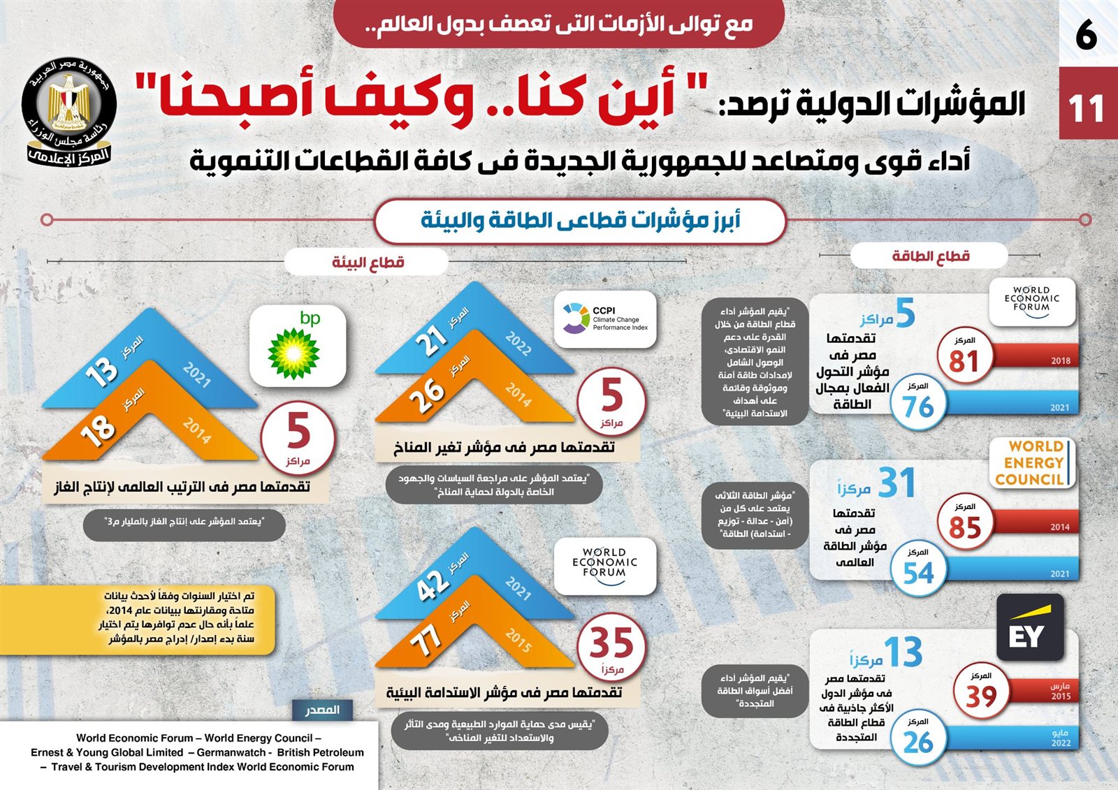 وفيما يتعلق بأبرز مؤشرات قطاع البيئة، فقد ورد في التقرير أن مصر تقدمت 5 مراكز في مؤشر تغير المناخ، الصادر عن Germanwatch والذي يعتمد على مراجعة السياسات والجهود الخاصة بالدولة لحماية المناخ، لتحتل المركز 21 عام 2022، مقابل المركز 26 عام 2014، فيما تقدمت مصر 5 مراكز في الترتيب العالمي لإنتاج الغاز، الصادر عن (BP ) والذي يعتمد على إنتاج الغاز بالمليار م3، حيث احتلت مصر المركز 13 عام 2021، مقابل المركز 18 عام 2014.