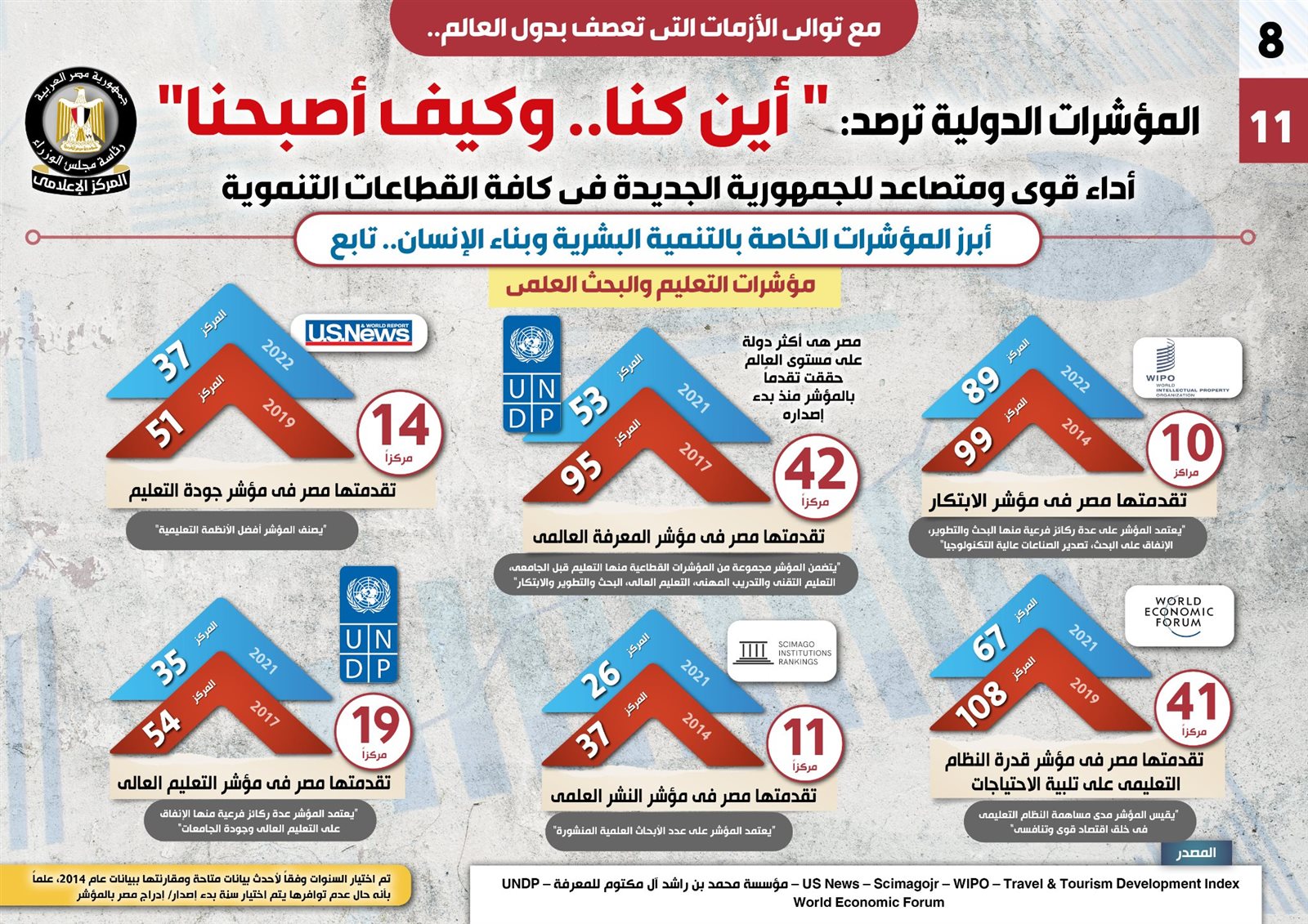 وورد في التقرير أن مصر تقدمت 14 مركزاً في مؤشر جودة التعليم الصادر عن US News والذي يصنف أفضل الأنظمة التعليمية، حيث احتلت مصر المركز 37 عام 2022، مقابل المركز 51عام 2019، وكذلك تقدمت مصر 11 مركزاً بمؤشر النشر العلمي Seimago حيث احتلت المركز 26 عام 2021، مقابل المركز 37 عام 2014، فضلاً عن تقدم مصر 10 مراكز بمؤشر الابتكار الصادر عن WIPO، والذي يعتمد على عدة ركائز فرعية منها البحث والتطوير، والإنفاق على البحث، وتصدير الصناعات عالية التكنولوجيا، لتأتي في المركز 89 عام 2022، مقابل المركز 99 عام 2014.