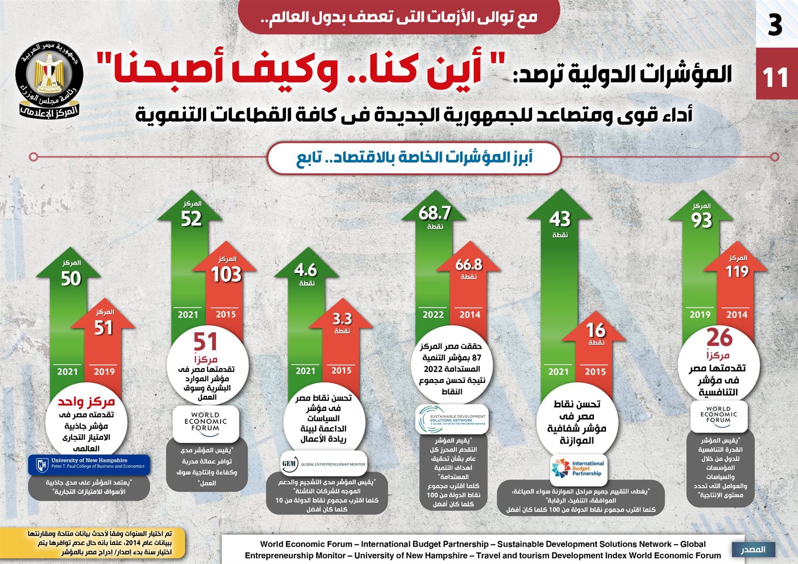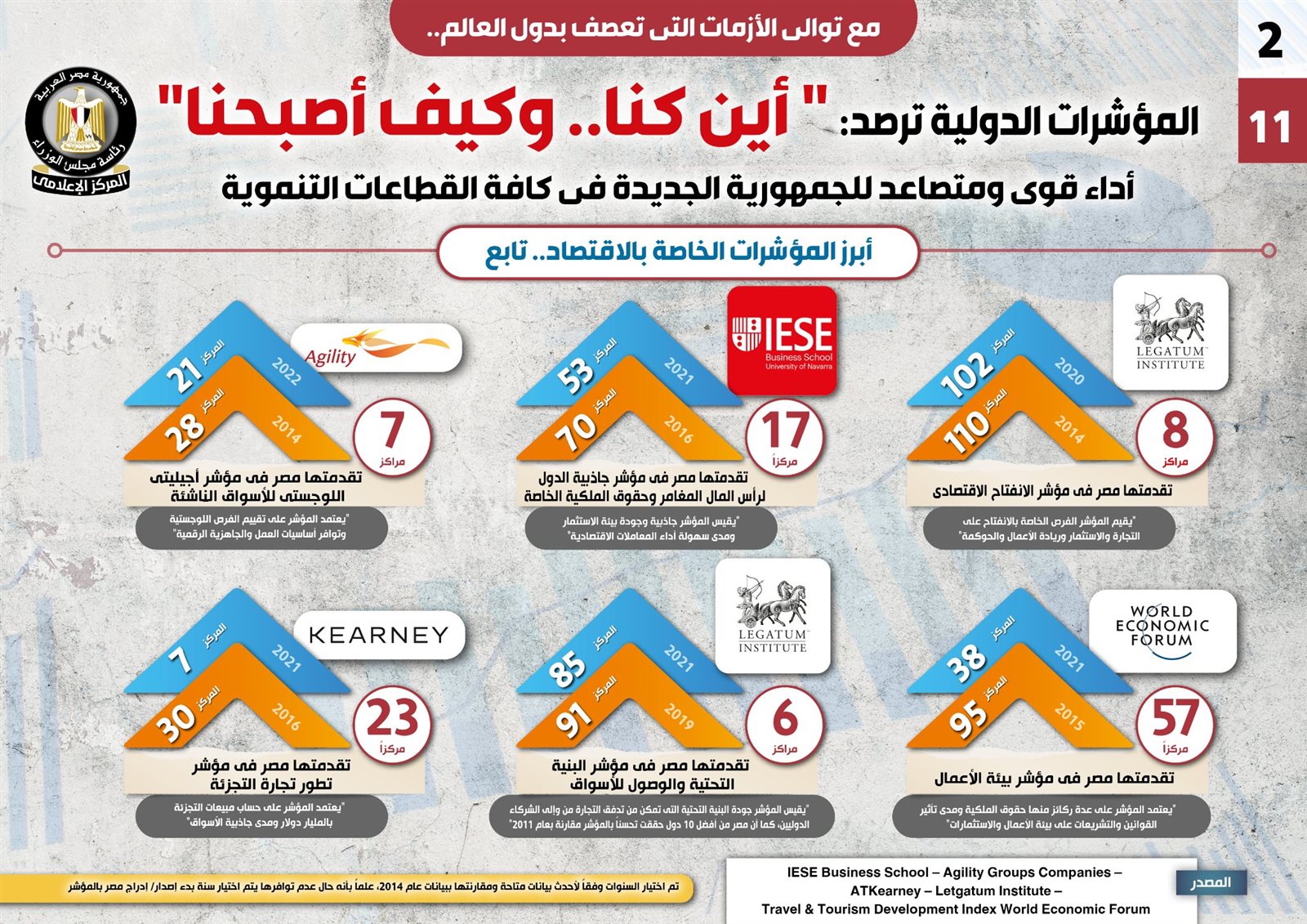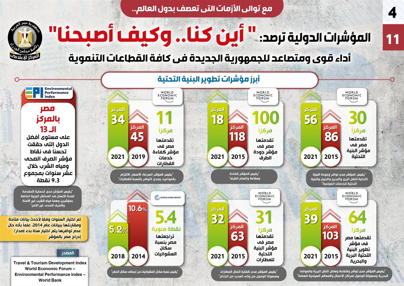 وفي هذا الصدد نشر المركز الإعلامي لمجلس الوزراء تقريراً تضمن إنفوجرافات تتناول رصد المؤشرات الدولية أين كنا وكيف أصبحنا، في ظل أداء قوي ومتصاعد للجمهورية الجديدة في كافة القطاعات التنموية على الرغم من توالي الأزمات التي تعصف بدول العالم.