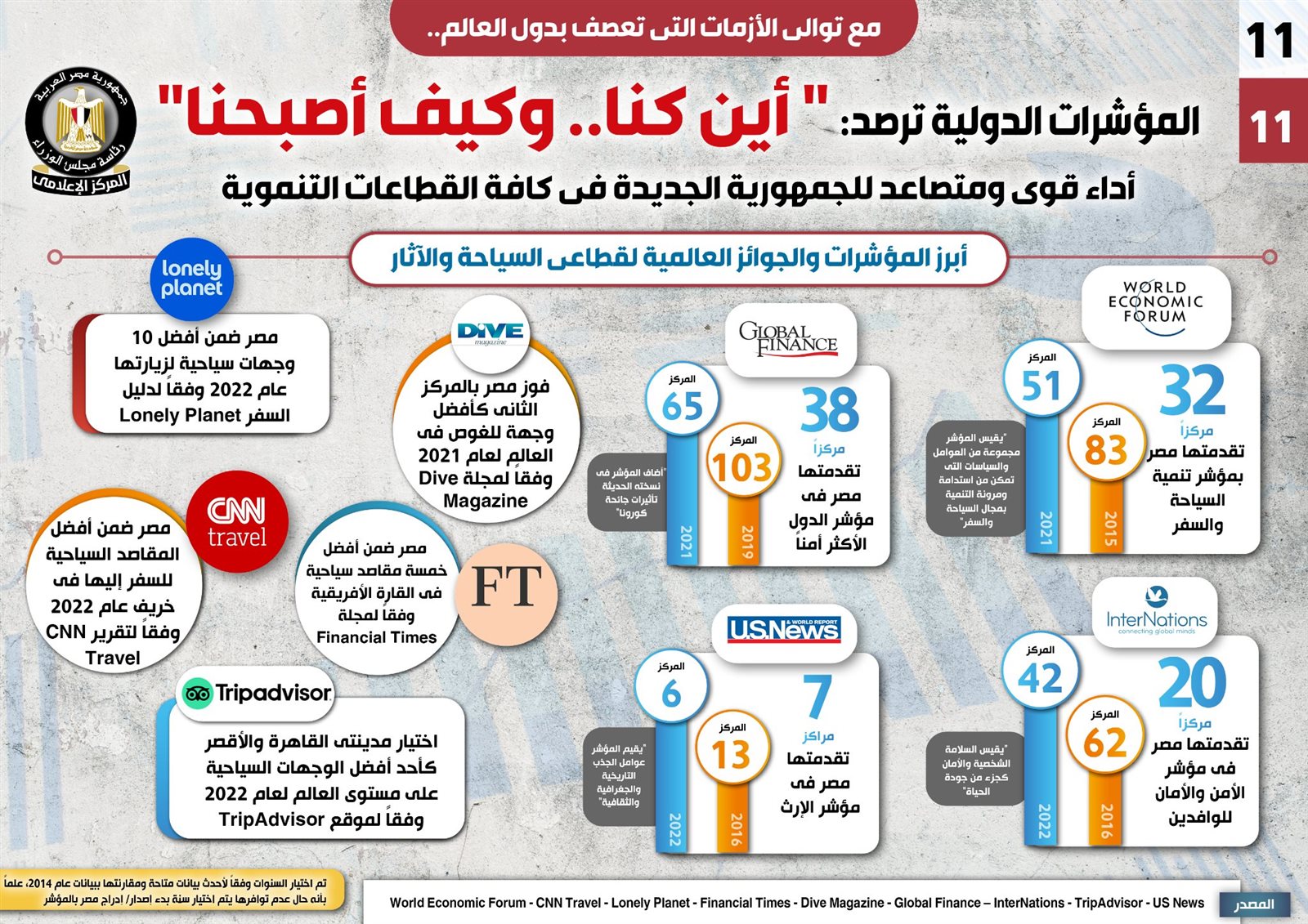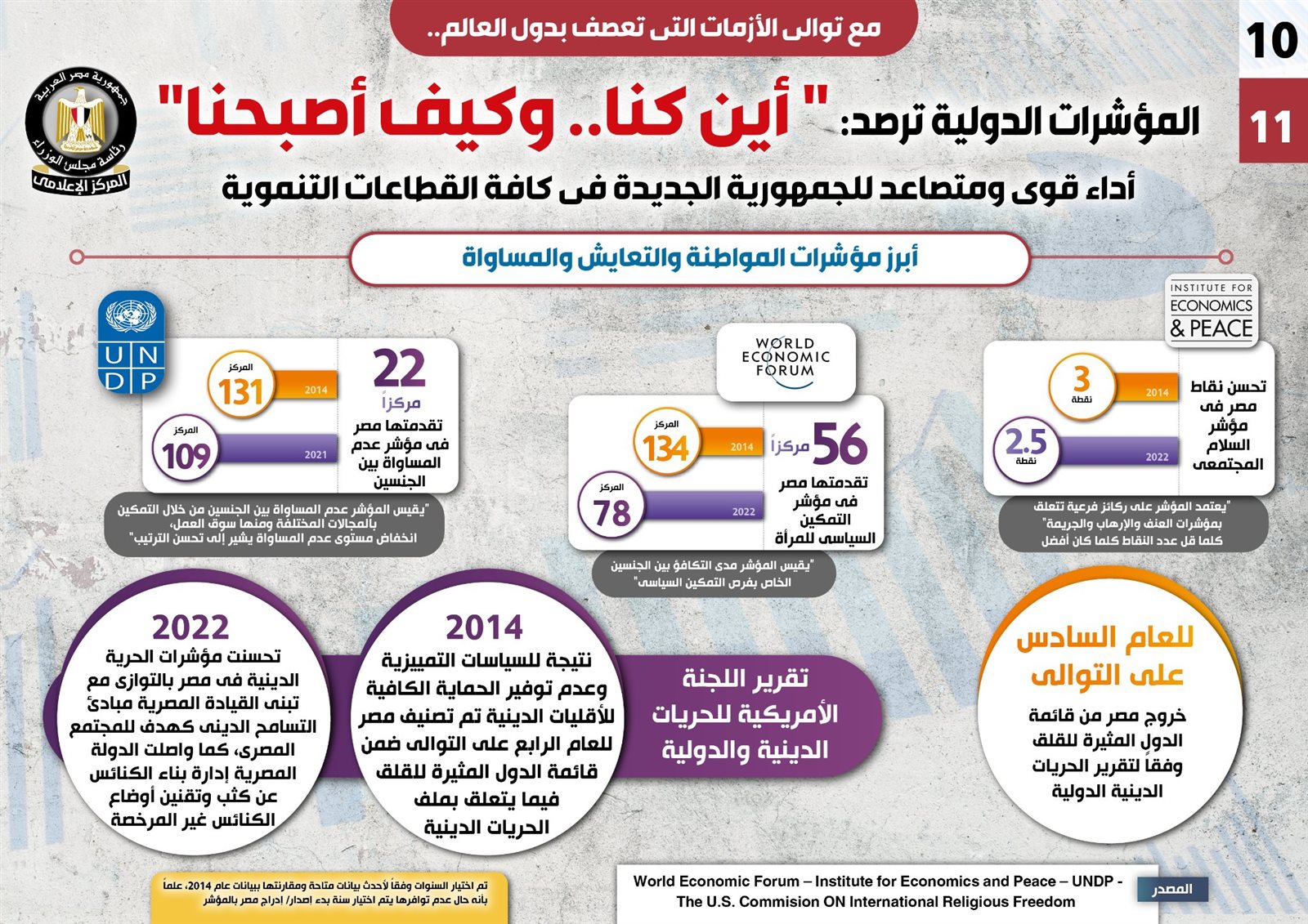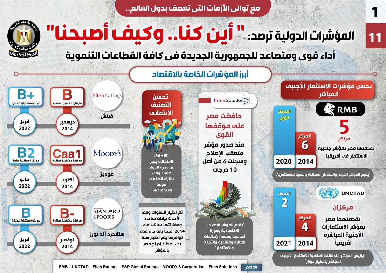 وفي هذا الصدد نشر المركز الإعلامي لمجلس الوزراء تقريراً تضمن إنفوجرافات تتناول رصد المؤشرات الدولية أين كنا وكيف أصبحنا، في ظل أداء قوي ومتصاعد للجمهورية الجديدة في كافة القطاعات التنموية على الرغم من توالي الأزمات التي تعصف بدول العالم.