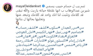 وقالت مى العيدان فى رسالتها لحسام حبيب ،" ياريت والله تبقى قد كلامك وتثبت لنا انك واحد قد كلامك وتبعد عنها وتخليها بحالها لبناتها".