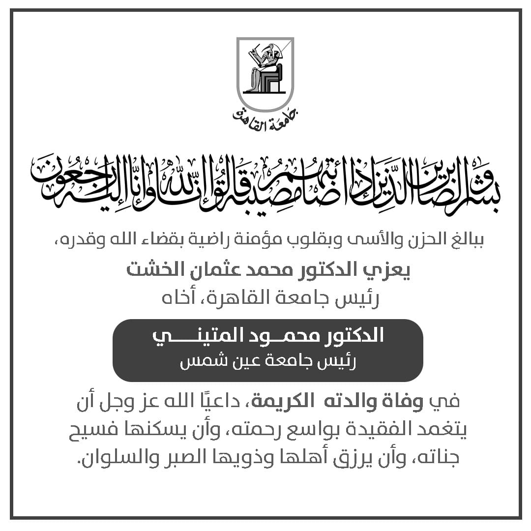 نعى رئيس جامعة القاهرة الدكتور محمد عثمان الخشت، في بيان له منذ قليل الدكتور محمود المتيني رئيس جامعة عين شمس، في وفاة والدته الكريمة.