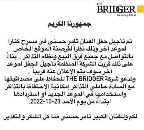 أعلنت الشركة المنظمة لحفل الفنان تامر حسني في مسرح كتارا بتأجيل الحفل بسبب قرصنة الموقع الخاص بالتواصل مع جميع فرق البيع ونظام التذاكر، ولم يتم توضيح موعد الحفل الجديد الذي سيعلن عنه قريبا.