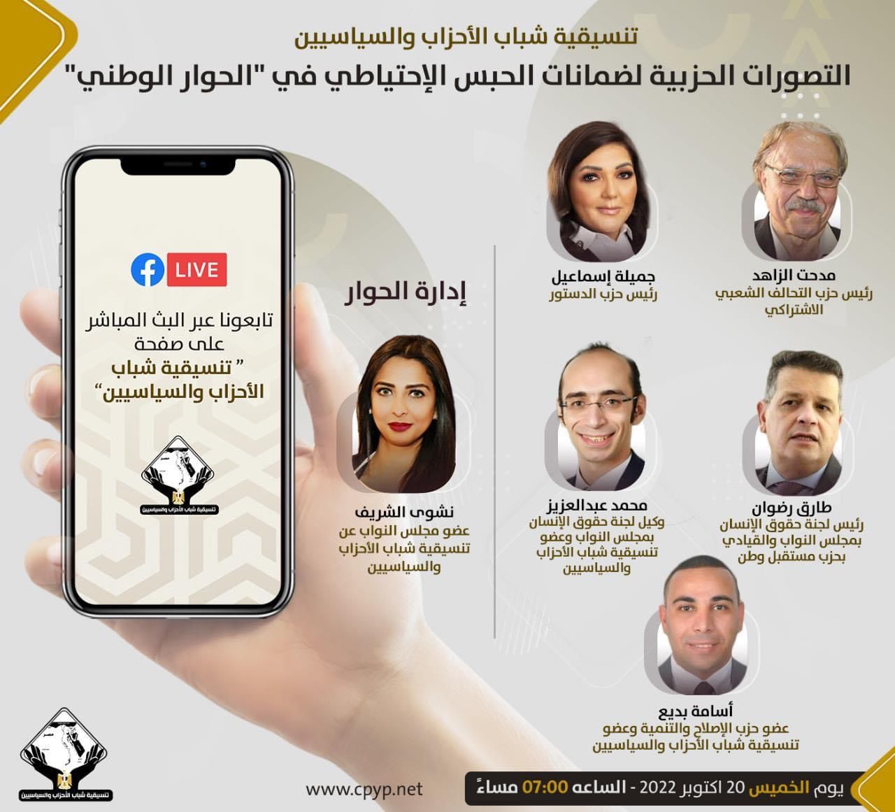 وكيف تعاملت الاستراتيجية الوطنية لحقوق الإنسان مع ملف الحبس الاحتياطي؟ وهل نحن بحاجة إلى قانون إجراءات جنائية جديد؟ وكيف يمكن أن يسهم الحوار الوطني في الاتفاق على نقاط لقانون الإجراءات الجنائية وبالتحديد في ملف الحبس الاحتياطي؟ ودور لجنة العفو الرئاسي في معالجة هذا الموضوع؟"، وغيرها من الأسئلة محل النقاش.