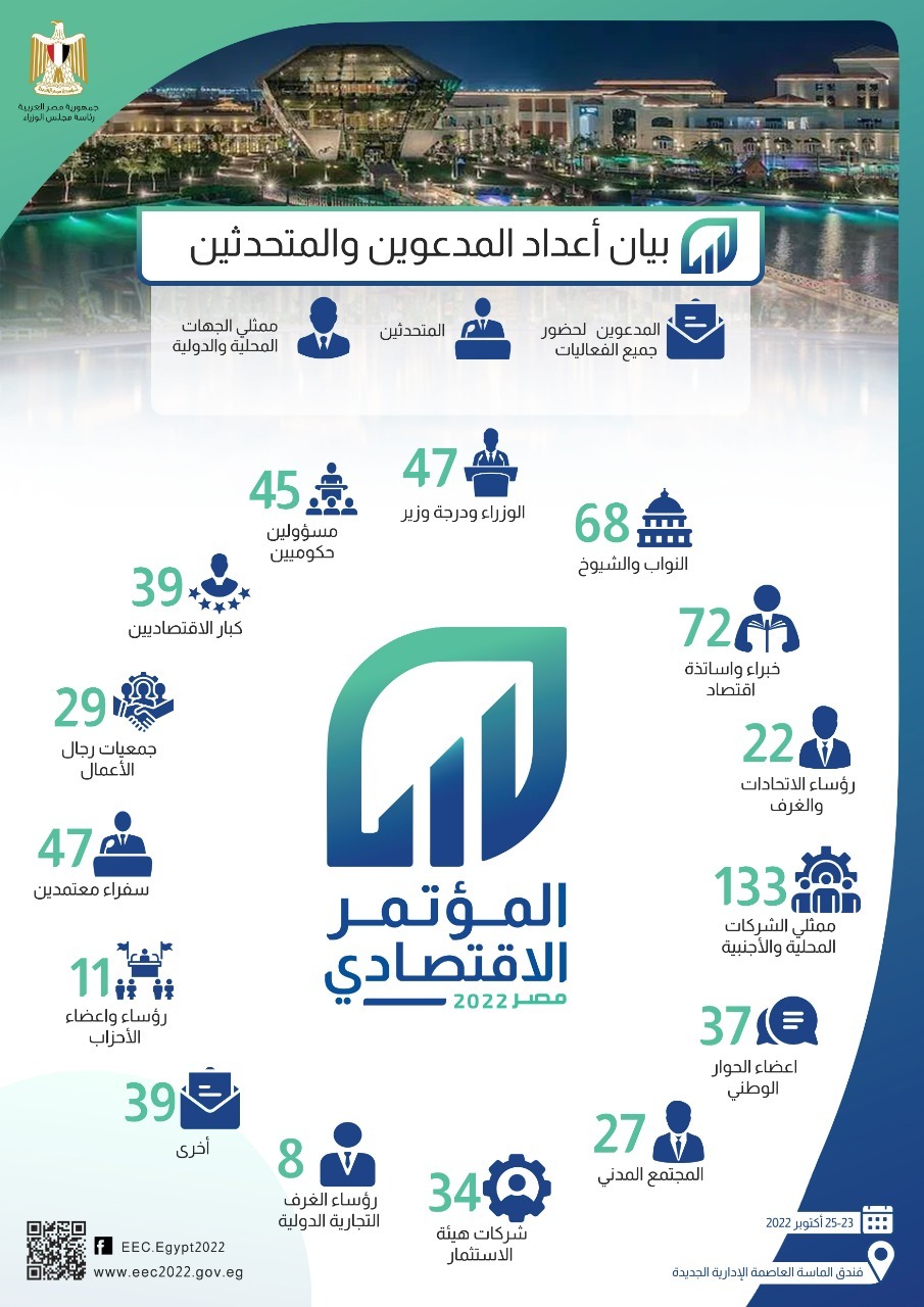 بتكليف من الرئيس عبد الفتاح السيسي؛ رئيس الجمهورية، تنطلق الأحد المٌقبل فعاليات "المؤتمر الاقتصادي ـ مصر 2022"، الذي تنظمه الحكومة المصرية خلال الفترة من 23 إلى 25 أكتوبر 2022؛ لمناقشة أوضاع ومستقبل الاقتصاد المصري، بمشاركة واسعة لنخبة من كبار الاقتصاديين، والمفكرين، والخبراء المتخصصين.