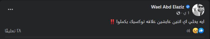 وكان آخر مانشره وائل عبد العزيز عبر حسابه الرسمي “فيس بوك”، منشورا تحدث فيه عن العلاقات التوكسيك، قائلا: “ايه يخلي اي اتنين عايشين علاقه توكسيك يكملوا؟؟”