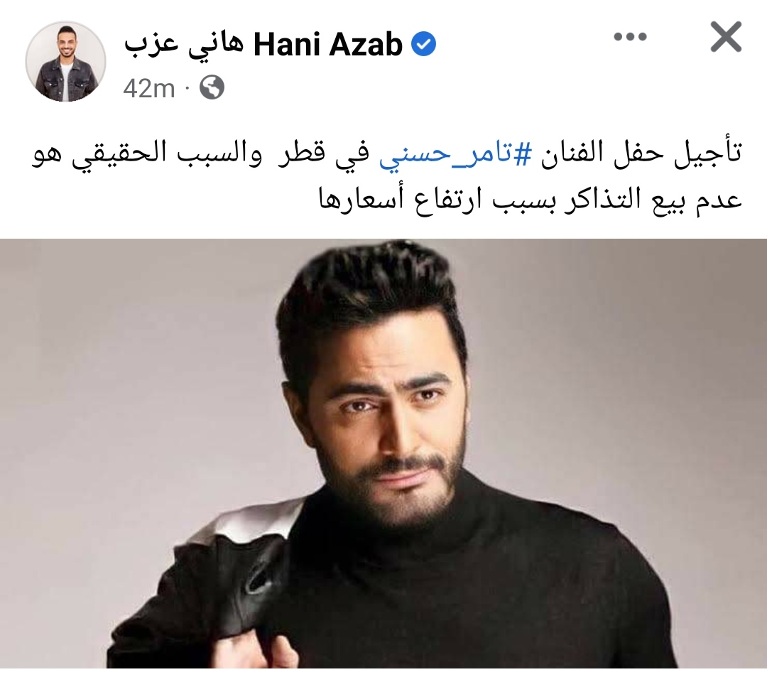 ونشر هاني عزب على صفحته عبر صفحته على موقع التواصل الإجتماعي الفيسبوك قائلا:"تأجيل حفل الفنان #تامر_حسني في قطر والسبب الحقيقي هو عدم بيع التذاكر بسبب ارتفاع أسعارها".