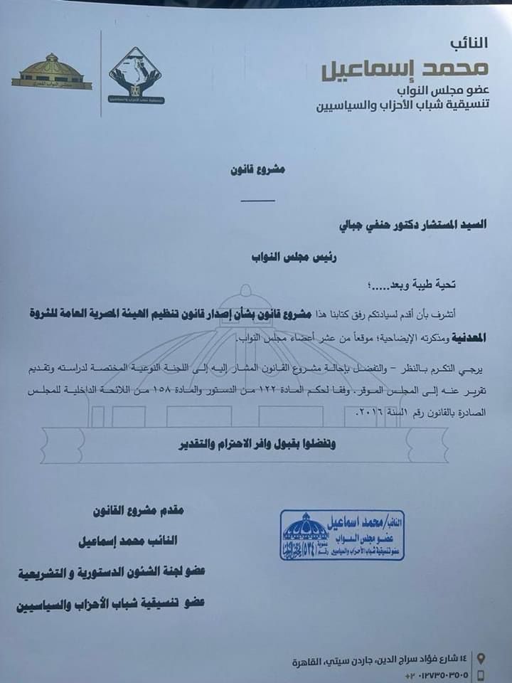 تقدم النائب محمد إسماعيل، عضو مجلس النواب عن تنسيقية شباب الأحزاب والسياسيين، بمشروع قانون بشأن إصدار قانون تنظيم الهيئة المصرية العامة للثروة المعدنية.