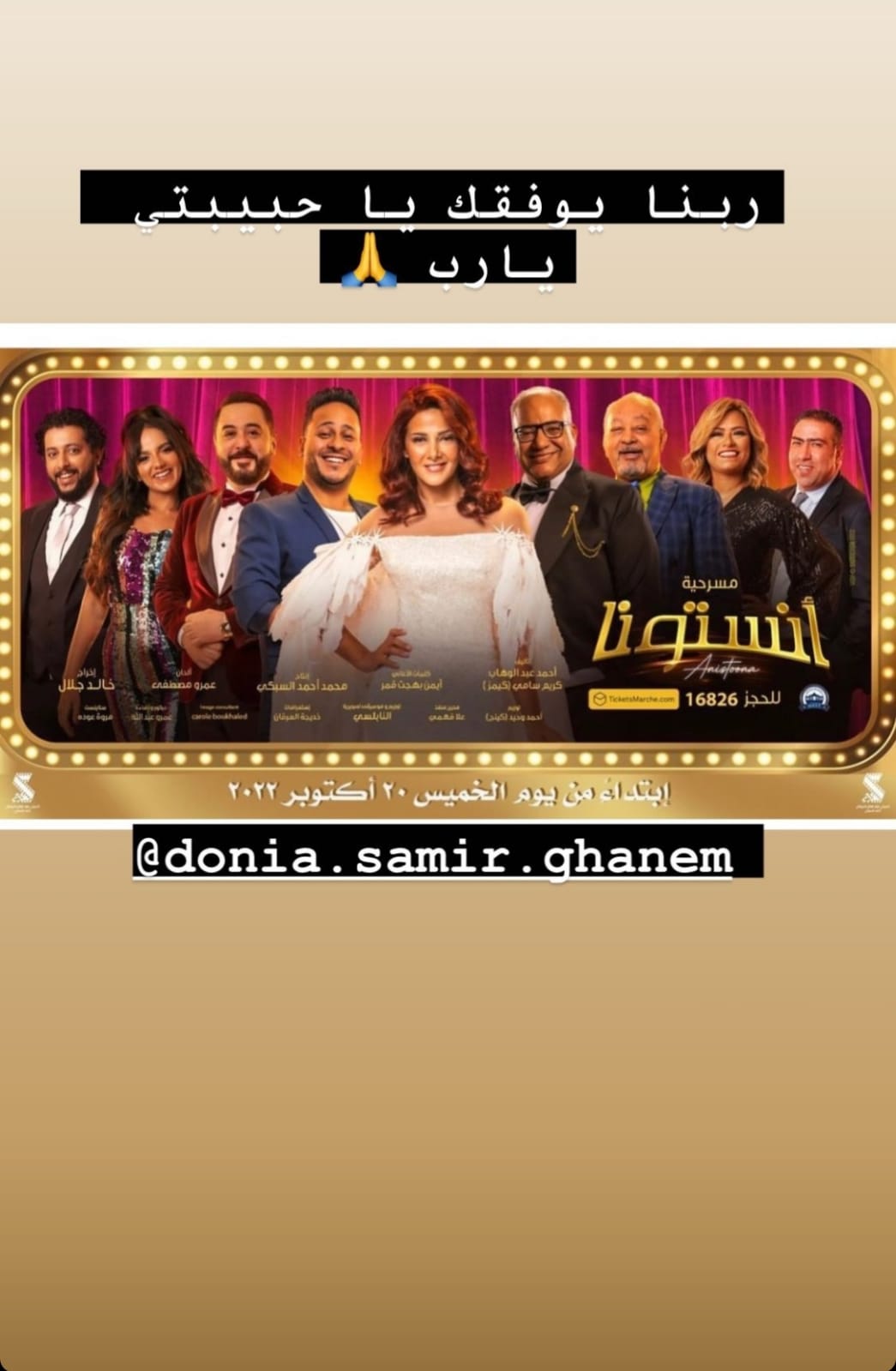 ونشرت إيمي سمير غانم بوسترالمسرحية عبر حسابها الشخصي بموقع تبادل الصور والفيديوهات "إنستجرام"، وعلقت قائلة: “ربنا يوفقك يا حبيتي وتكسري الدنيا”.