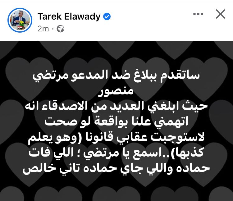 وقال طارق العوضي ، عبر صفحته الشخصية على موقع التواصل الاجتماعى ،" فيس بوك"،" سأتقدم ببلاغ ضد المدعو مرتضي منصور، موضحًا:"ابلغني العديد من الأصدقاء أنه اتهمني علنا بواقعة لو صحت لاستوجبت عقابي قانونا (وهو يعلم كذبها)..اسمع يا مرتضي ؛ اللي فات حماده واللي جاي حماده تاني خالص".