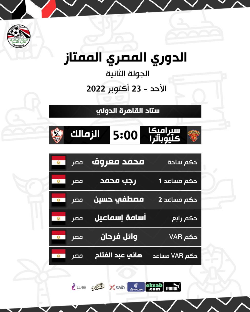 بينما جاء اختارت لجنة المسابقات لمبارة الزمالك وسيراميكا كليوباترا، محمد معروف حكم أول، ورجب محمد ومصفى حسين، حكام مساعدين، واسامة اسماعيل حكم رابع، ولتقنية الفار كلًا من وائل فرحان وهانى عبدالفتاح.