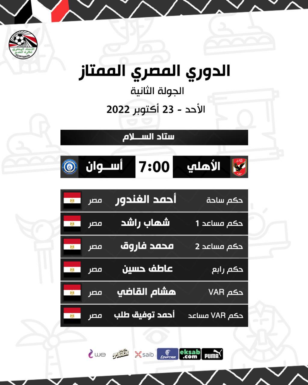 ويدير مبارة الأهلي واسوان، أحمد الغندور حكم أول، وشهاب رشاد ومحمد فاروق حكام مساعدين، وعاطف حسين حكم رابع، وفي تقنية الفارهشام القاضي واحمد توفيق.