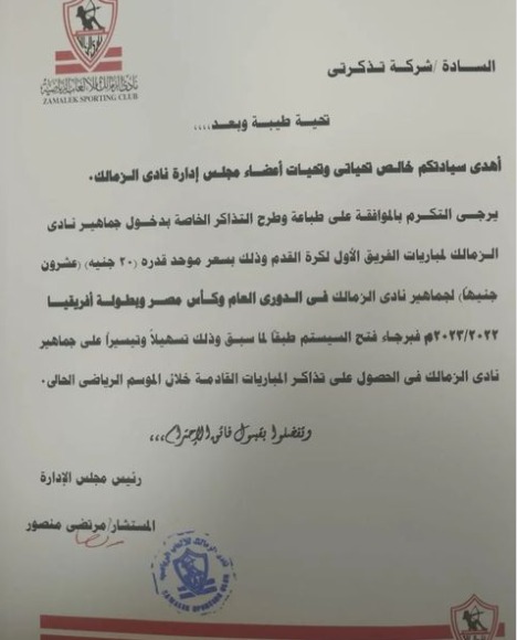 أعلن مرتضي منصور رئيس نادي الزمالك عن مخاطبته لشركة تذكرتي المسئولة عن توزيع تذاكر مباريات الفرق المصرية للبطولات المحلية والافريقية، لتخفيض سعر تذكرة نادي الزمالك واعتمادها بسعر 20 جنيهاً للتذكرة في جميع البطولات التي يشارك بها الزمالك.
