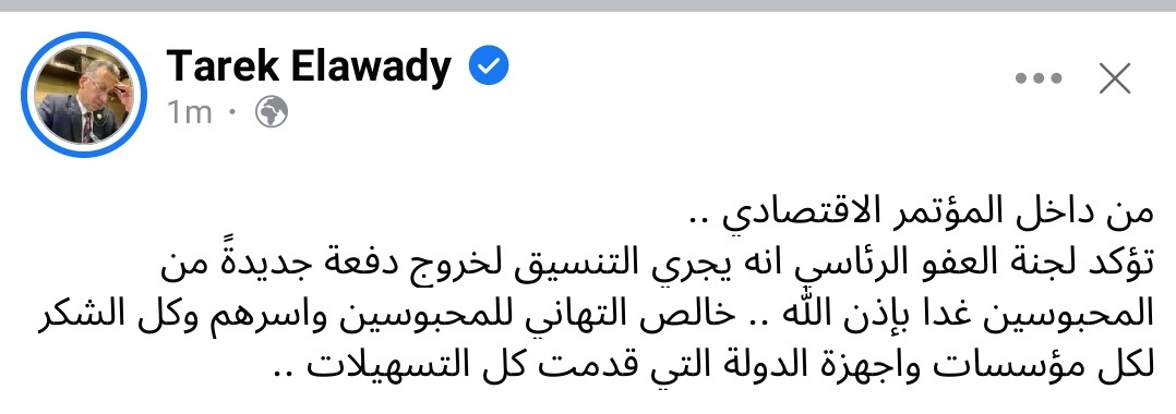 قال طارق العوضي، المحامي بالنقض وعضو لجنة العفو الرئاسي، إن لجنة العفو الرئاسي تؤكد انه يجري التنسيق لخروج دفعة جديدةً من المحبوسين غدا الاثنين، موجها التهاني للمحبوسين وأسرهم وكل الشكر لكل مؤسسات وأجهزة الدولة التي كل التسهيلات.