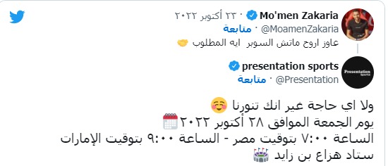 وكتب مؤمن زكريا عبر حسابه الرسمي على موقع التواصل الاجتماعي "تويتر" قائلا: عاوز اروح ماتش السوبر ايه المطلوب، لترد شركة برزنتيش على تغريته قائلة: ولا أي حاجة غير انك تنورنا يوم الجمعة الموافق 28 أكتوبر 2022، الساعة 7:٠٠ بتوقيت مصر- الساعة 9:٠٠ بتوقيت الإمارات، استاد هزاع بن زايد .