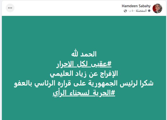 وكتب السياسي البارز حمدين صباحي، مؤسس التيار الشعبي، خلال صفحته الشخصية، على موقع التواصل الاجتماعي فيسبوك: عقبى لك الأحرار، الإفراج عن زياد العليمي، شكرا لرئيس الجمهورية على قراره الرئاسي بالعفو، الحرية لسجناءالرأي.