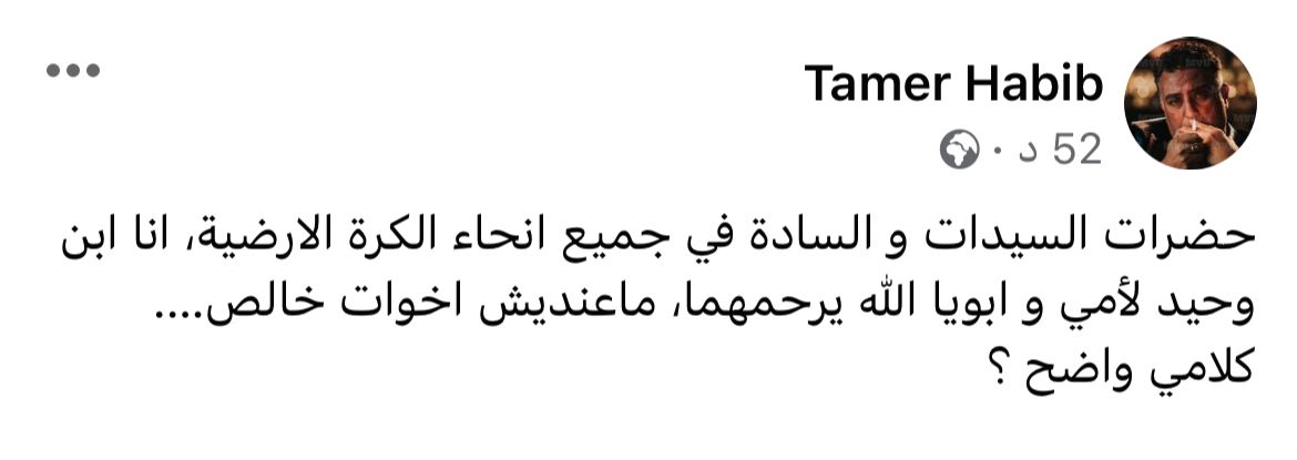 وكتب تامر حبيب عبر حسابه الرسمي بموقع التواصل الاجتماعي “فيس بوك”، " حضرات السيدات والسادة في جميع انحاء الكرة الأرضية ، انا ابن وحيد لأمي وأبويا الله يرحمهما ماعنديش اخوات خالص كلامي واضح؟