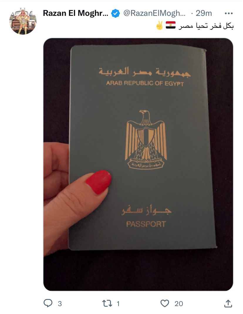 أعربت الفنانة رزان مغربي، عن سعادتها لحصولها بشكل رسمي على الجنسية المصرية، ونشرت رزان صورة الجواز المصرى لها عبر حسابها على موقع التدوينات القصيرة" تويتر"، وكتبت قائلة: "بكل فخر تحيا مصر".