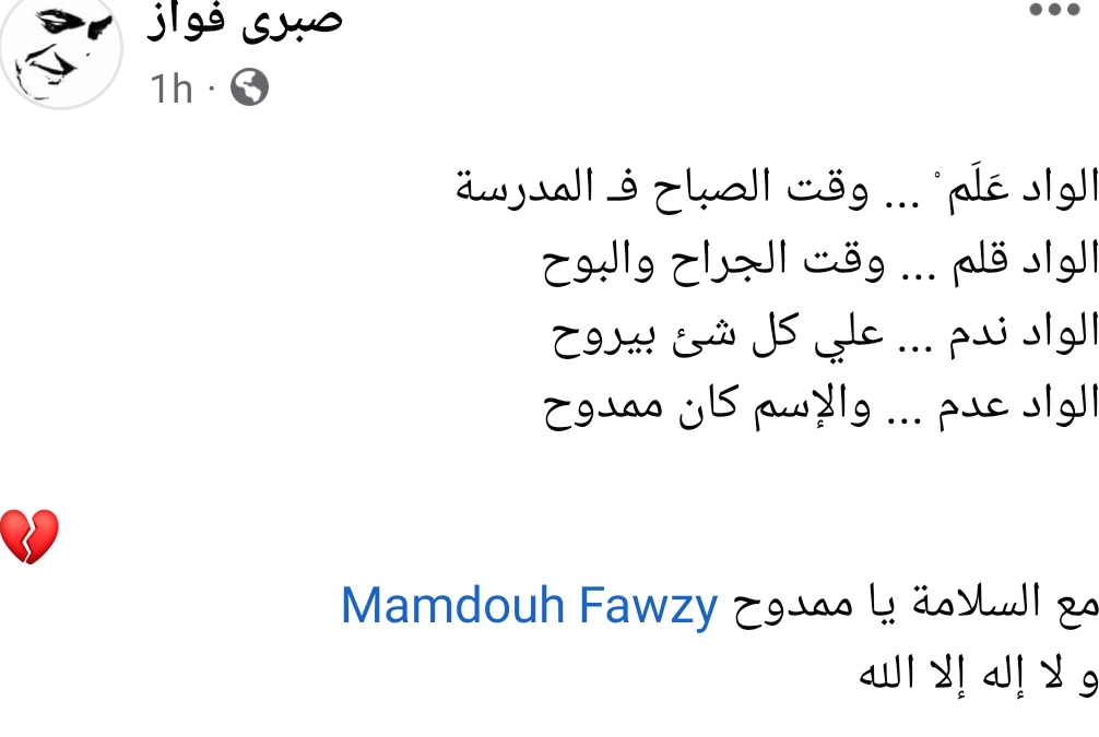 قائلة: لا إله إلا الله إنا لله وإنا إليه راجعون، صدمة من أكبر صدمات حياتي والله، صديقي وعشرة العمر الشاعر الجميل ممدوح فوزي في ذمة الله".