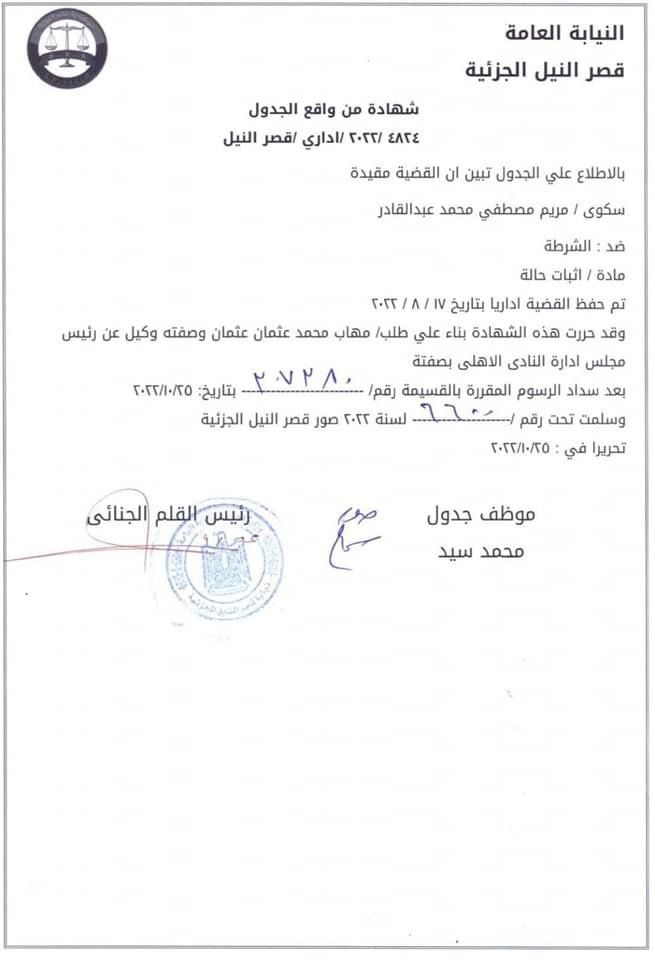 وكان مجلس إدارة الأهلي قد كلف مهاب عثمان وكيلا عن المجلس لمتابعة القضية واتخاذ كافة الإجراءات التي تحفظ حقوق النادي.