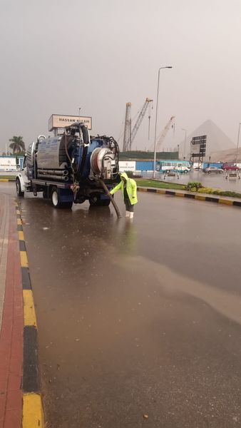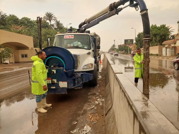 وأكد المهندس منصور بدوي رئيس شركة مياه الشرب والصرف الصحي بالجيزة، أنه يتم التعامل الفوري مع مياه الأمطار وسحبها بمعدات الشركة المنتشرة على كافة الطرق والمحاور الرئيسية ومنازل ومطالع الكباري بمحافظة الجيزة.