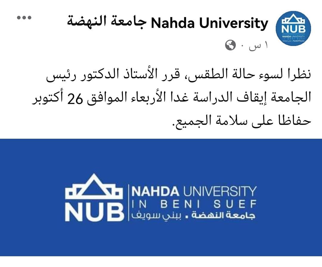ونشرت عبر صفحتها على مواقع التواصل الاجتماعى " الفيس بوك ": نظراً لسوء حالة الطقس، قرر الدكتور حسام الملاحي رئيس الجامعة إيقاف الدراسة غداً الأربعاء الموافق 26 أكتوبر حفاظا علي سلامة الجميع.