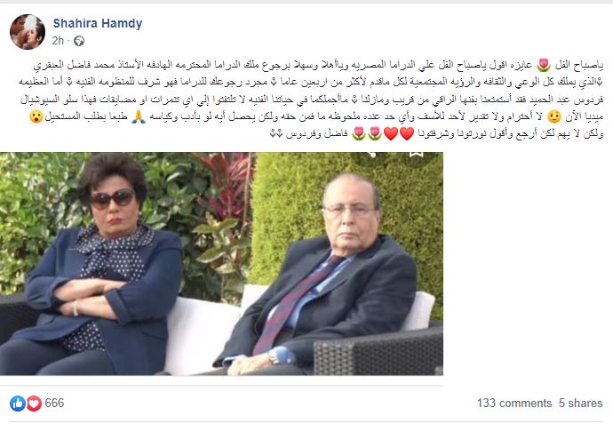 وقالت شهيرة عبر صفحتها على موقع التواصل الاجتماعى فيسبوك: “يا صباح الفل..عايزة أقول يا صباح الفل على الدراما المصرية، ويا أهلًا وسهلًا برجوع ملك الدراما المحترمة الهادفة الأستاذ محمد فاضل العبقري”.