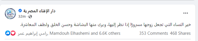 قالت دار الإفتاء المصرية، عبر صفحتها الرسمية بموقع التواصل الاجتماعي"فيس بوك"، ان خير النساء التي تجعل زوجها مسرورًا إذا نظر إليها ويرى منها البشاشة وحسن الخلق ولطف المعاشرة.