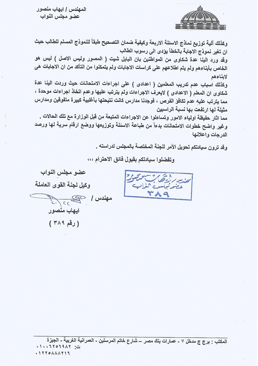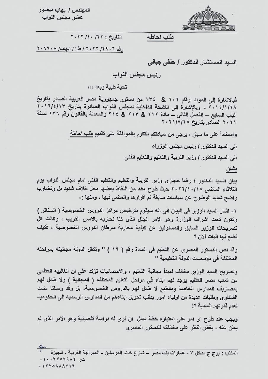 تقدم المهندس إيهاب منصور، رئيس الهيئة البرلمانية للحزب المصري الديمقراطي الاجتماعي بطلب إحاطة موجه إلى رئيس مجلس الوزراء، ووزير التربية والتعليم والتعليم الفني بشان بيان الدكتور رضا حجازي، وزير التربية والتعليم والتعليم الفني أمام مجلس النواب يوم الثلاثاء الماضي، والذي طرح خلاله عدد من النقاط بعضها محل خلاف شديد بل وتضارب واضح بينها وبين سياسات سابقة تم اقرارها والمضى فيها .