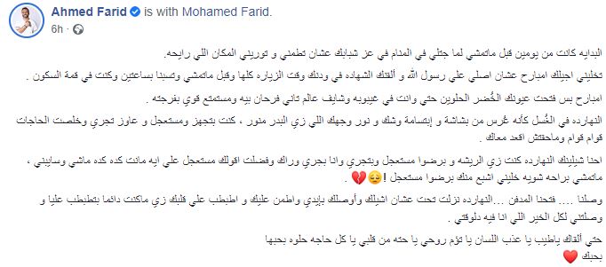 واختتم "فريد" كلامه: "النهارده نزلت تحت عشان اشيلك وأوصلك بإيدي واطمن عليك واطبطب علي قلبك زي ماكنت دائما بتطبطب عليا و وصلتني لكل الخير اللي انا فيه دلوقتي حتي ألقاك ياطيب يا عذب اللسان يا تؤم روحي يا حته من قلبي يا كل حاجه حلوه بحبها..بحبك".