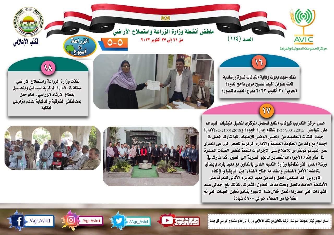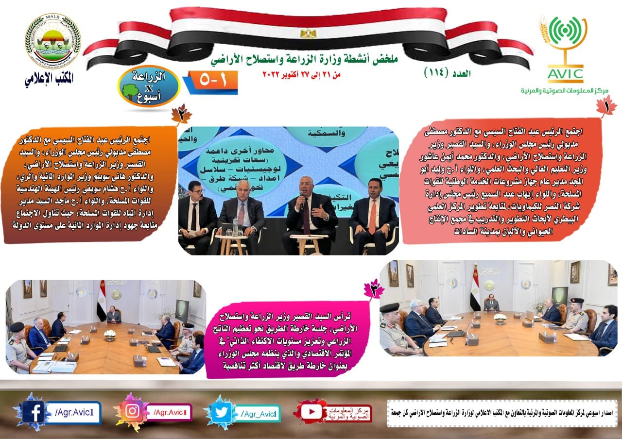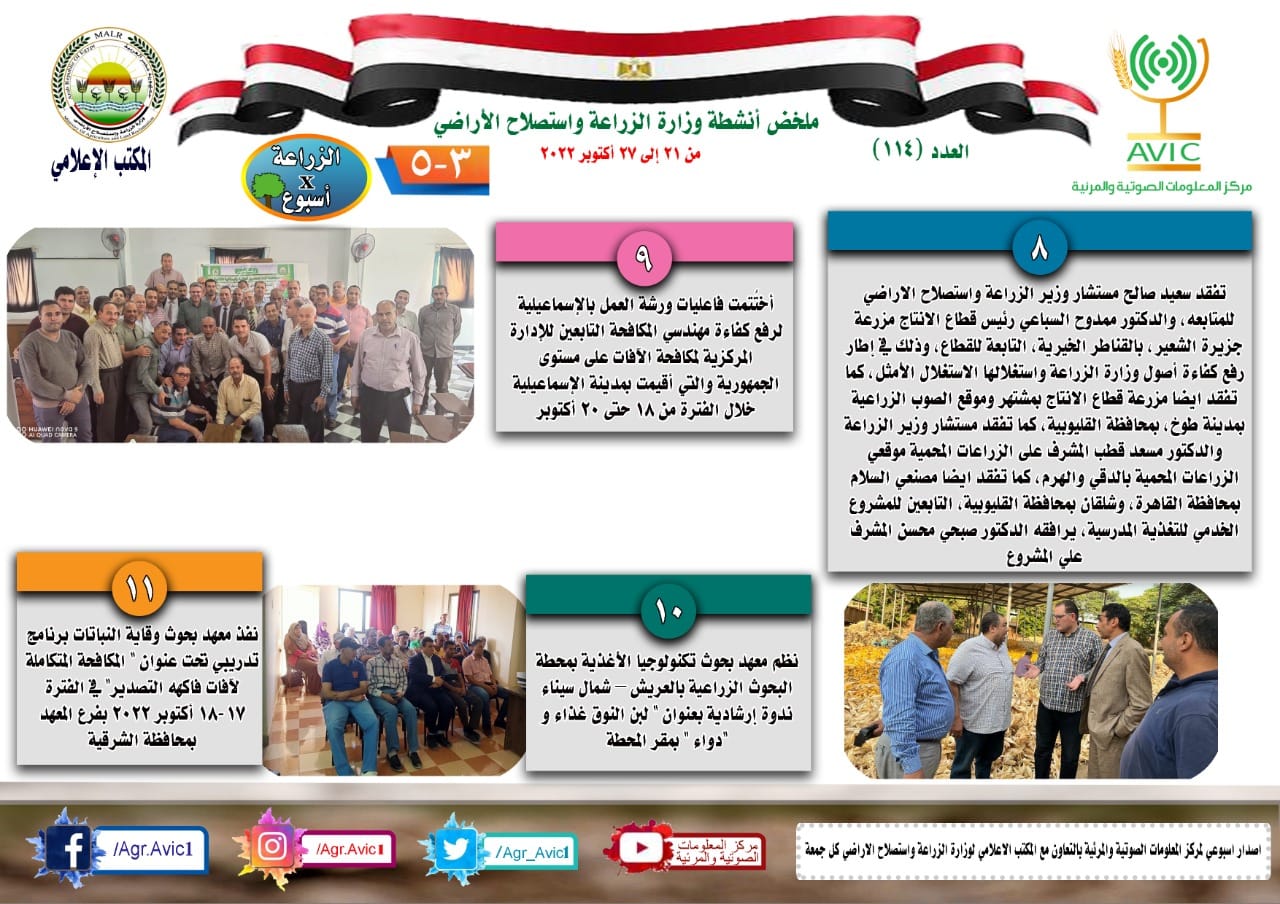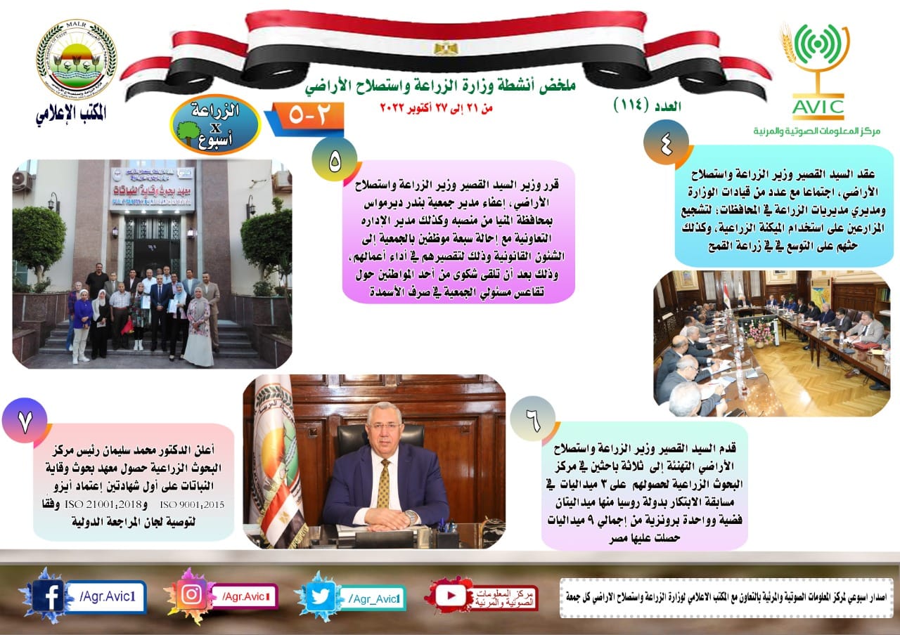 أصدر مركز المعلومات الصوتية والمرئية، التابع لوزارة الزراعة واستصلاح الأراضي، "الانفوجراف الأسبوعي" في نسخته رقم 114، حول الحصاد الأسبوعي لأهم أنشطة الوزارة، خلال الأسبوع الماضي في الفترة من 21 وحتى 27 أكتوبر الجاري، وذلك بالتعاون مع المكتب الإعلامي للوزارة، كما أصدر المركز ايضا ملخصا بالفيديو، حول أنشطة الوزارة خلال نفس الفترة.