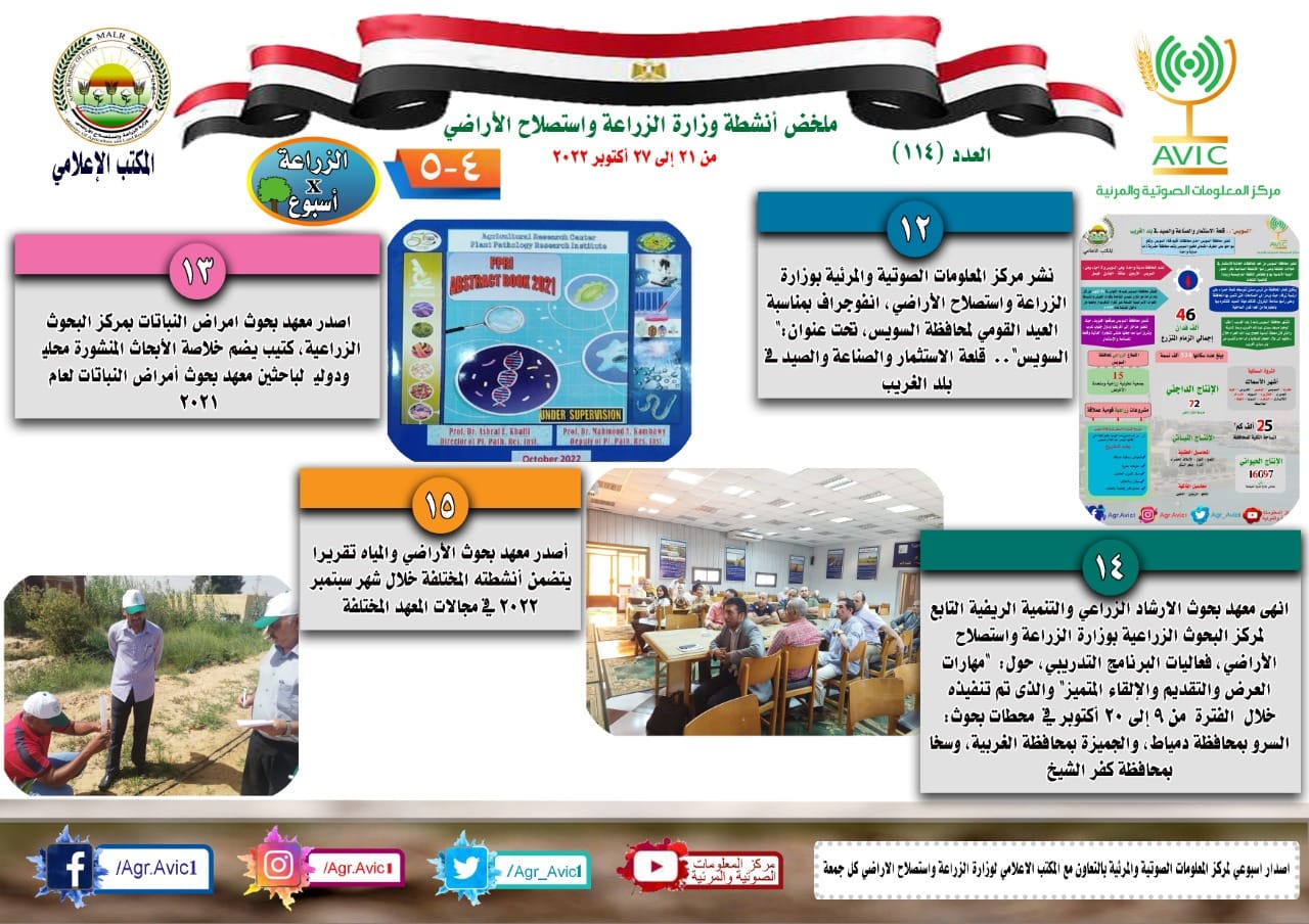 ونشر مركز المعلومات الصوتية والمرئية بوزارة الزراعة واستصلاح الأراضي، انفوجراف بمناسبة العيد القومي لمحافظة السويس، تحت عنوان: "السويس".. قلعة الاستثمار والصناعة والصيد فى بلد الغريب، كما أصدر معهد بحوث امراض النباتات بمركز البحوث الزراعية، كتيب يضم خلاصة الأبحاث المنشورة محلياً ودولياً لباحثين معهد بحوث أمراض النباتات لعام 2021، كذلك انهى معهد بحوث الارشاد الزراعي والتنمية الريفية التابع لمركز البحوث الزراعية بوزارة الزراعة واستصلاح الأراضي، فعاليات البرنامج التدريبي، حول: "مهارات العرض والتقديم والإلقاء المتميز" والذى تم تنفيذه خلال الفترة من 9 إلى 20 أكتوبر في محطات بحوث: السرو بمحافظة دمياط، والجميزة بمحافظة الغربية، وسخا بمحافظة كفر الشيخ.