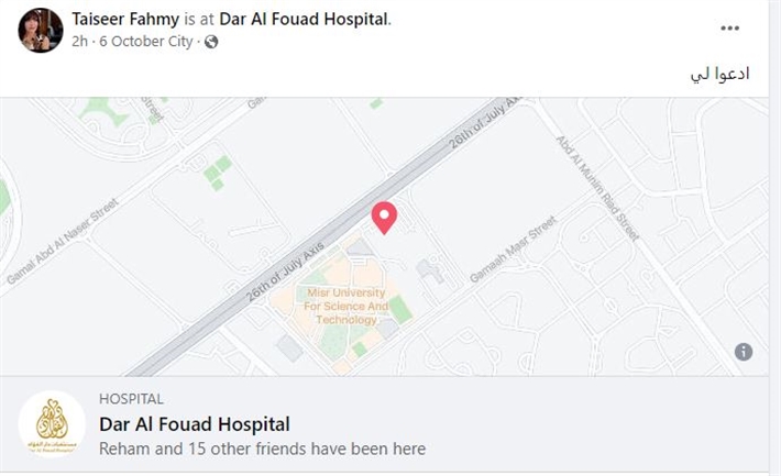 ونشرت تيسير فهمي موقع المستشفى عبر حسابها الشخصي على موقع التواصل الاجتماعي “فيس بوك” وكتبت قائلة: "ادعولي".