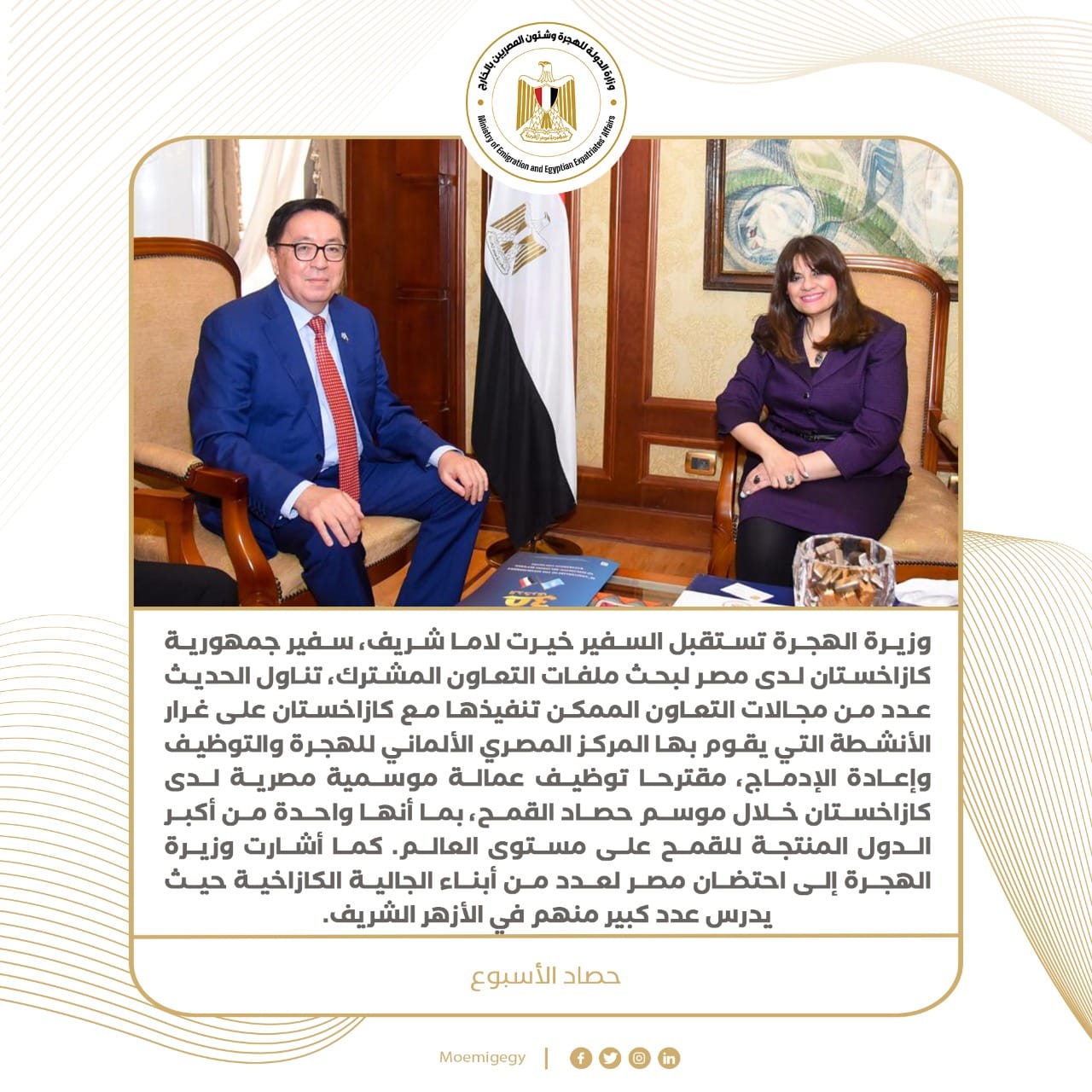 وزيرة الهجرة السفيرة سها جندي تستقبل السفير خيرت لاما شريف، سفير جمهورية كازاخستان لدى مصر لبحث ملفات التعاون المشترك، تناول الحديث عدد من مجالات التعاون الممكن تنفيذها مع كازاخستان على غرار الأنشطة التي يقوم بها المركز المصري الألماني للهجرة والتوظيف وإعادة الإدماج، مقترحا توظيف عمالة موسمية مصرية لدى كازاخستان خلال موسم حصاد القمح، بما أنها واحدة من أكبر الدول المنتجة للقمح على مستوى العالم. كما أشارت وزيرة الهجرة إلى احتضان مصر لعدد من أبناء الجالية الكازاخية حيث يدرس عدد كبير منهم في الأزهر الشريف.