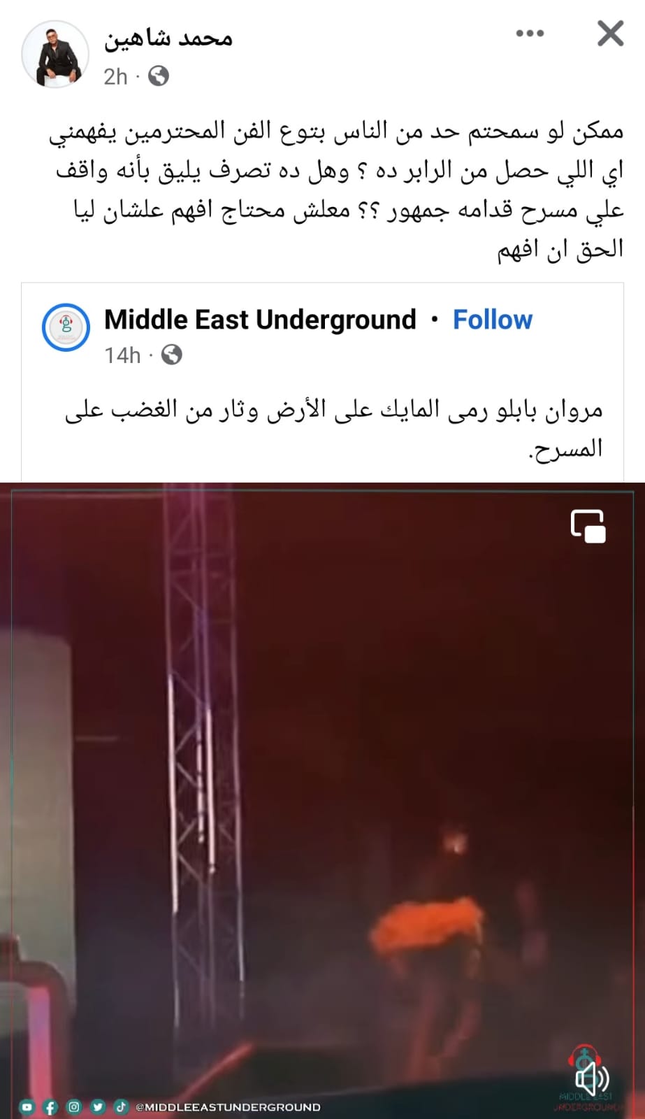 انتقد المطرب محمد شاهين، على فيديو المطرب الراب مروان بابلو، بعد إنفعاله على المسرح بسبب مشكلة تقنية في الصوت مما جعله يترك المسرح لعدة دقائق.
