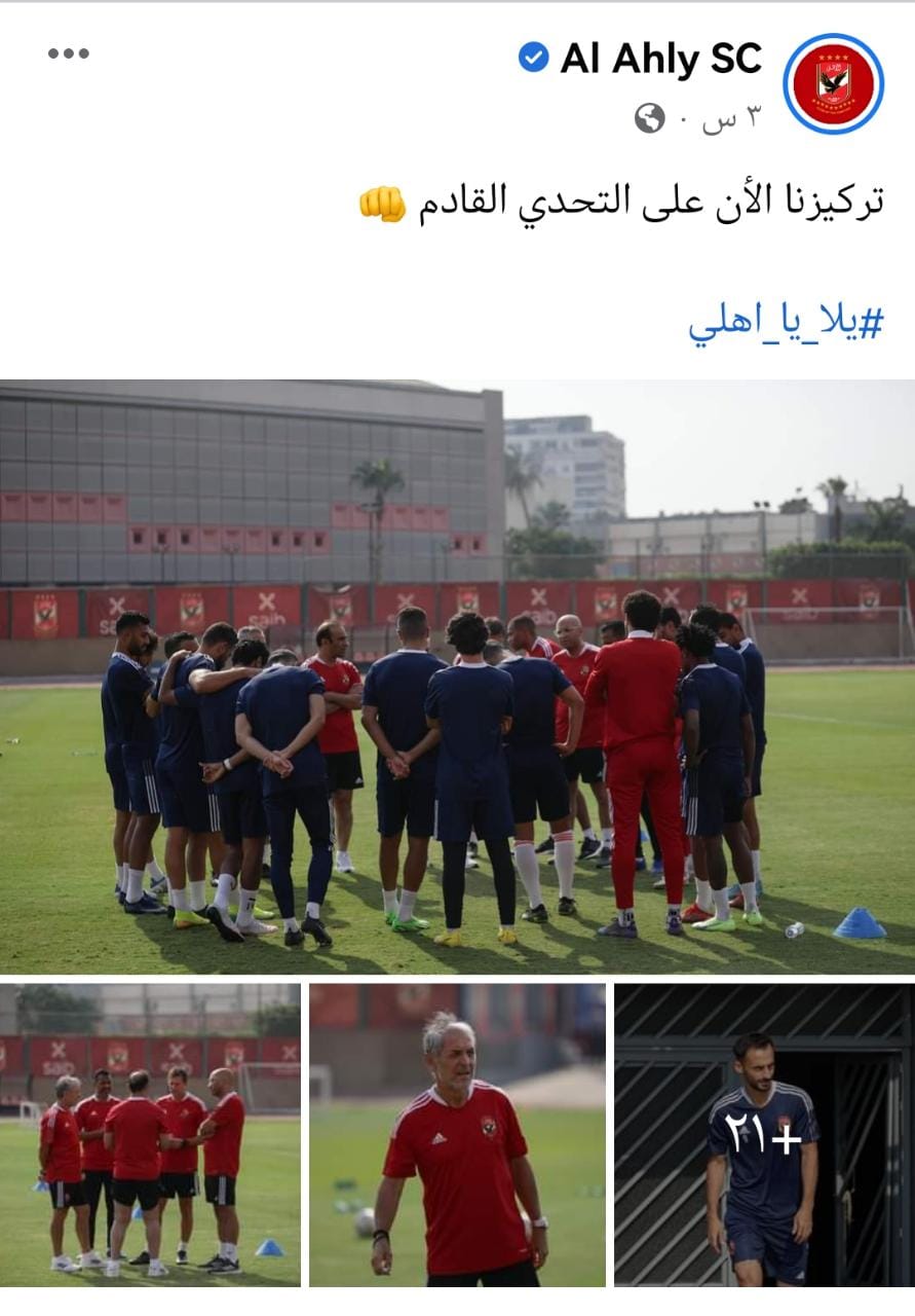 ونشرت الصفحة الرسمية للأهلي عبر مواقع التواصل الإجتماعي "فيس بوك": صوراً من مران الفريق اليوم، على ملعب مختار التتش، دون راحة، عقب التتويج بلقب السوبر المصرى أمس الجمعة على حساب الزمالك، وعلقت الصفحة الرسمية على صور المران بعد العودة للتدريبات، "تركيزنا الآن على التحدي القادم".