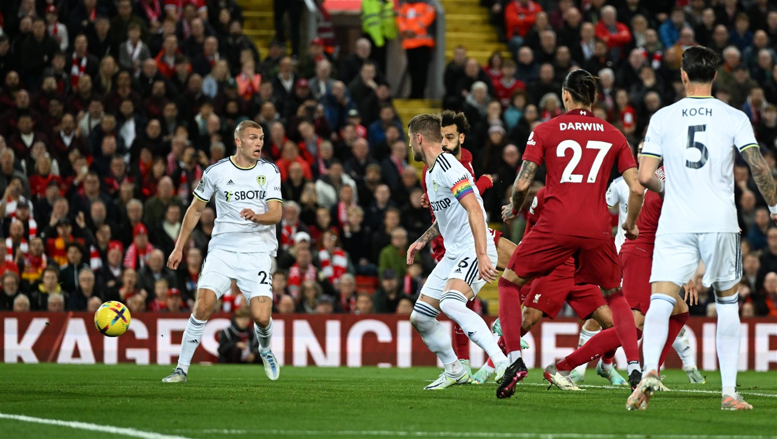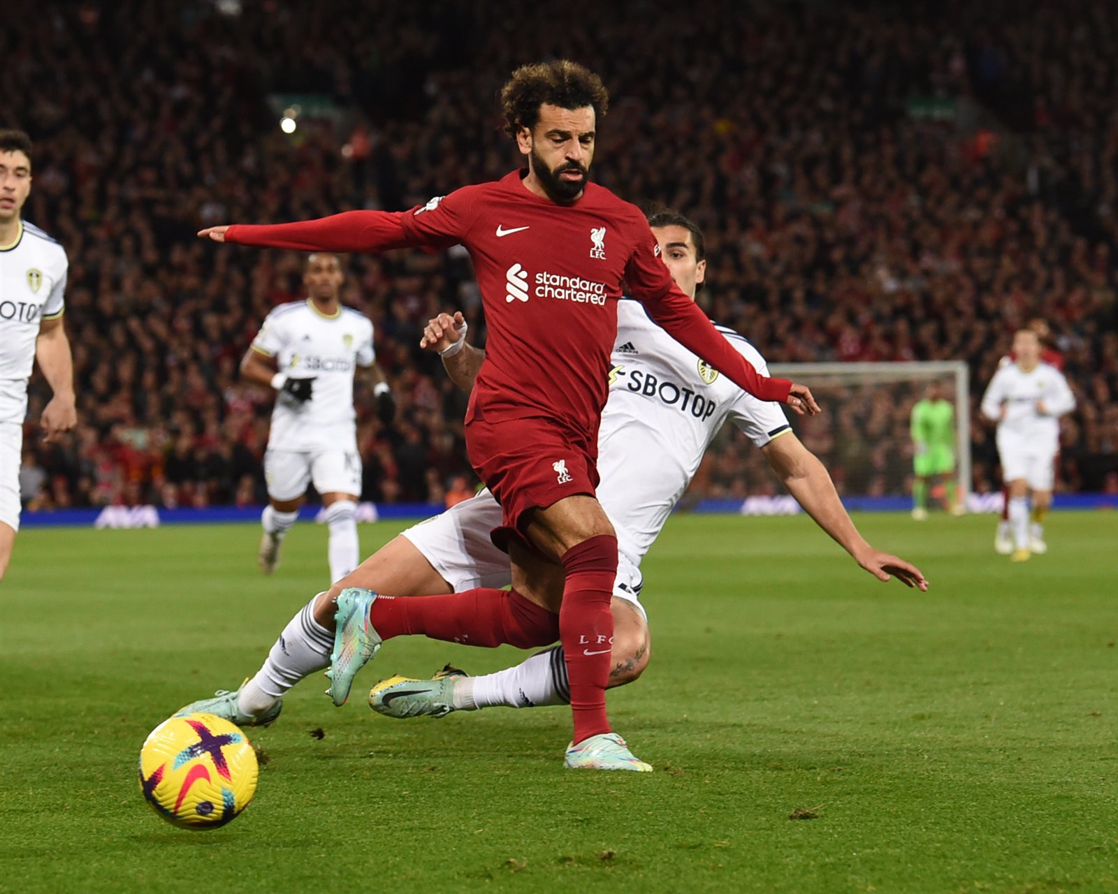وسجل رودريجو بعد مرور 4 دقائق على بداية اللقاء، بينما تعادل محمد صلاح لفريق ليفربول في الدقيقة 14، بعد عرضية مُتقنة من الجهة اليسرى لتصل الكرة لمحمد صلاح الذي يرسلها بيُسراه داخل شباك ليدز بأسيست من أندرو روبرتسون.