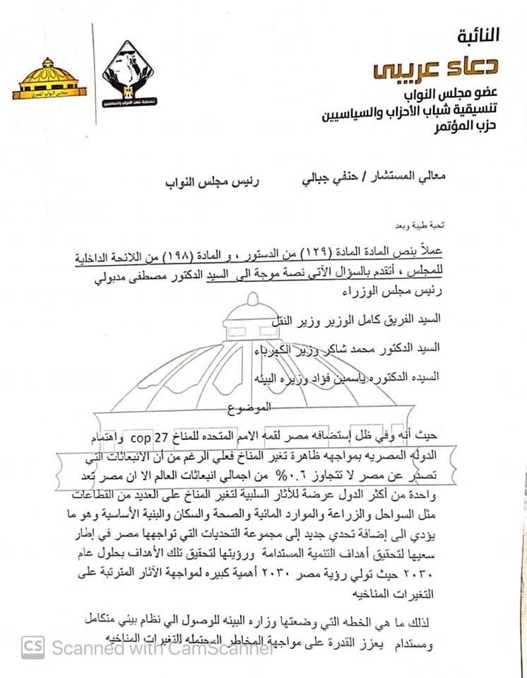 وقالت في السؤال الموجه إلى الدكتور مصطفى مدبولي رئيس مجلس الوزراء الفريق كامل الوزير وزير النقل و الدكتور محمد شاكر وزير الكهرباء و الدكتوره ياسمين فؤاد وزيره البيئه " في ظل إستضافه مصر لقمه الامم المتحده للمناخ 27 cop ، واهتمام الدوله المصريه بمواجهه ظاهرة تغير المناخ.