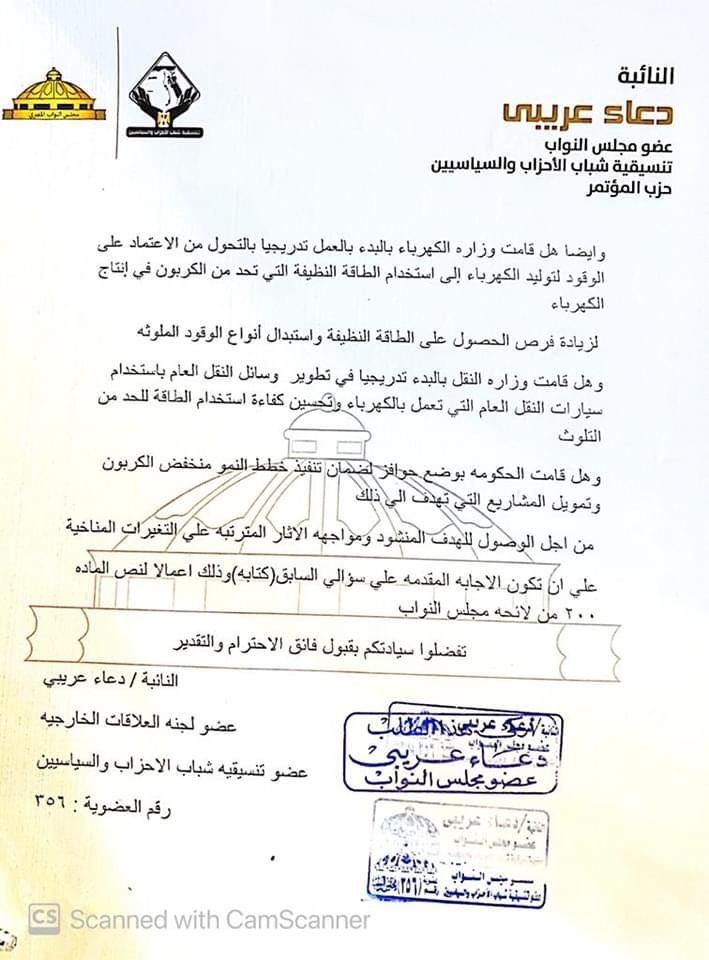 وقالت في سؤالها هل قامت وزاره الكهرباء بالبدء بالعمل تدريجيا بالتحول من الاعتماد على الوقود لتوليد الكهرباء إلى استخدام الطاقة النظيفة التي تحد من الكربون في إنتاج الكهرباء لزيادة فرص الحصول على الطاقة النظيفة واستبدال أنواع الوقود الملوثه.