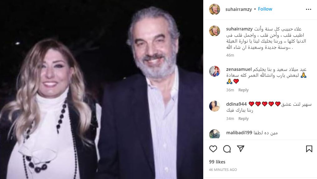 وظهرت سهير رمزي برفقة زوجها وعلقت، قائلة: "علاء حبيبى كل سنة وأنت اطيب قلب ، وأحن قلب واجمل قلب فى الدنيا كلها ، وربنا يخليك لينا يا نوارة العيلة ،وسنة جديدة وسعيدة ان شاء الله".