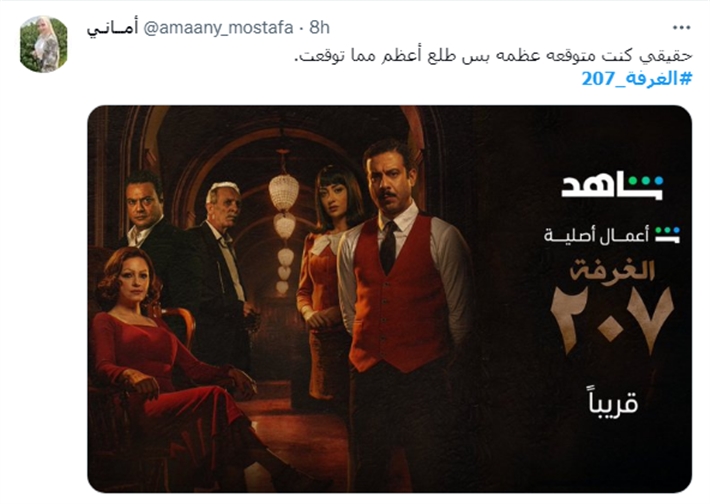تفاعل رواد مواقع التواصل الاجتماعي مع الحلقة الأولى والثانية من مسلسل "الغرفة 207"،وعبروا عن إعجابهم به وبأداء كل المشاركين.