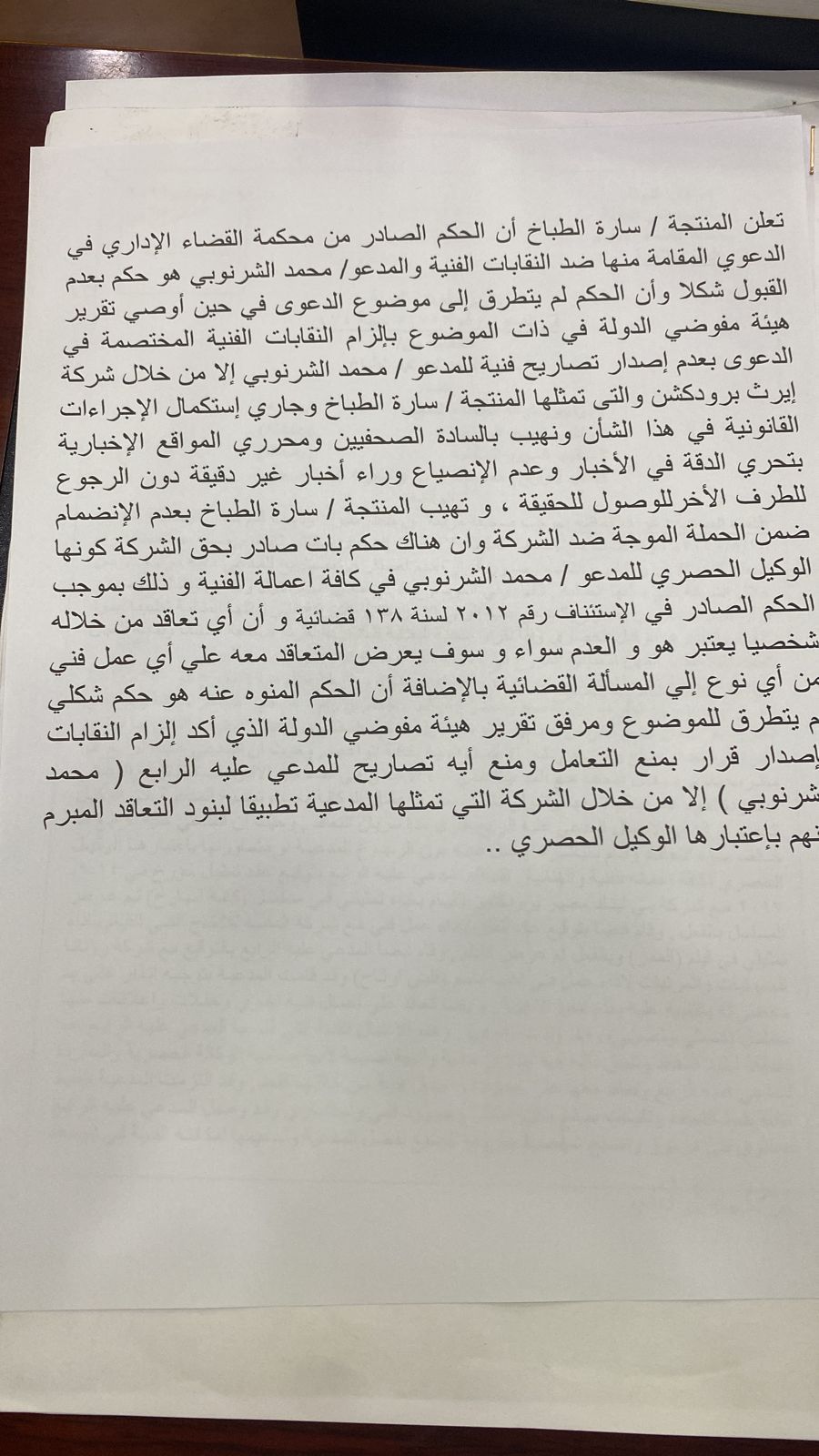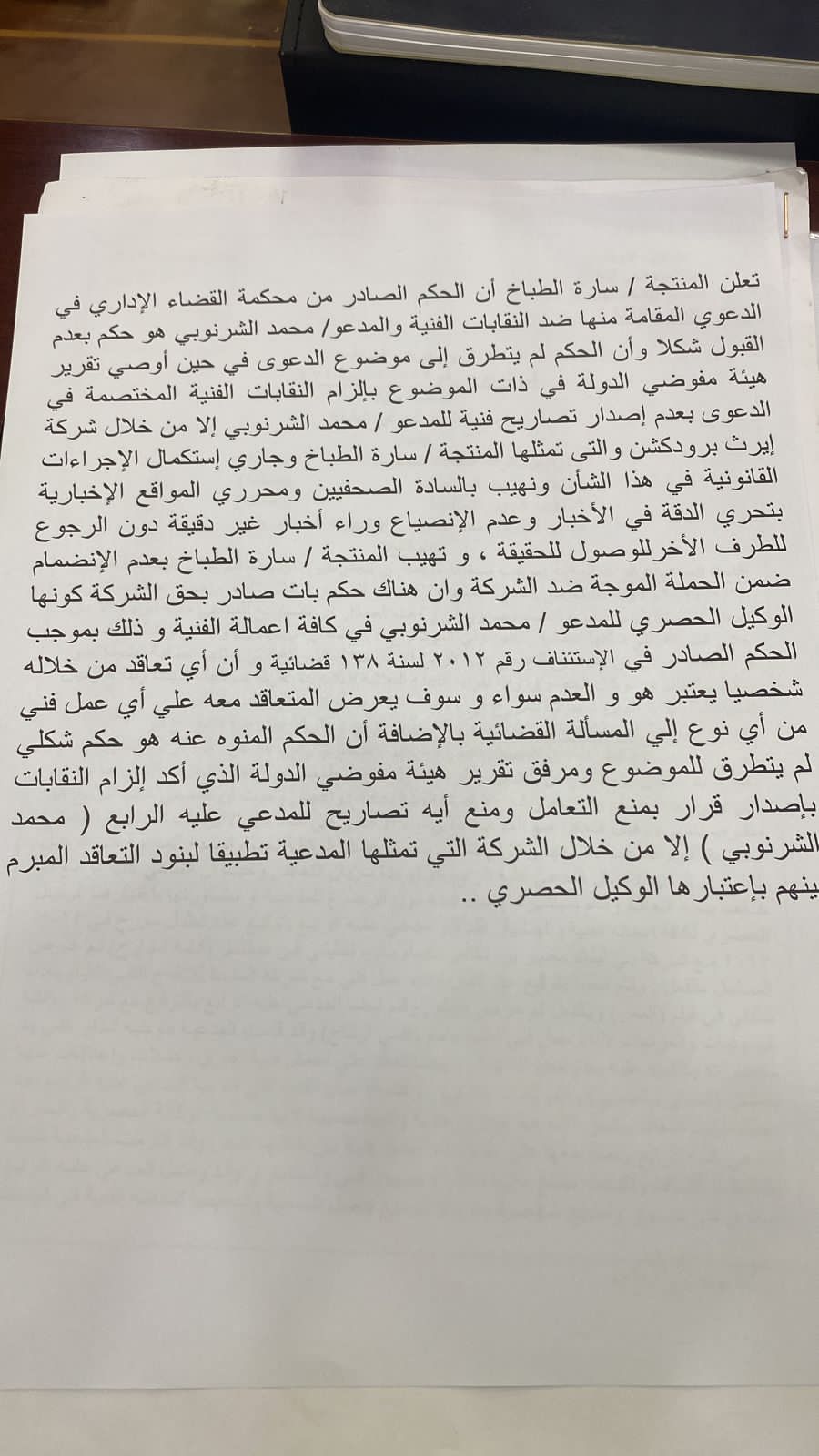 ويتضمن بيان سارة الطباخ: " تعلن المنتجة / سارة الطباخ أن الحكم الصادر محكمة القضاء الإداري في الدعوي المقامة منها ضد النقابات الفنية والمدعو/ محمد الشرنوبي هو حكم بعدم القبول شكلا وأن الحكم لم يتطرق إلى موضوع الدعوى في حين أوصي تقرير هيئة مفوضي الدولة في ذات الموضوع بإلزام النقابات الفنية المختصمة في الدعوى بعدم إصدار تصاريح فنية للمدعو / محمد الشرنوبي إلا من خلال شركة إيرث برودكشن والتي تمثلها المنتجة / سارة الطباخ وجاري إستكمال الإجراءات القانونية في هذا الشأن ونهيب بالسادة الصحفيين ومحرري المواقع الإخبارية الدقة في الأخبار وعدم الإنصياع وراء أخبار غير دقيقة دون للطرف الأخر للوصول للحقيقة.