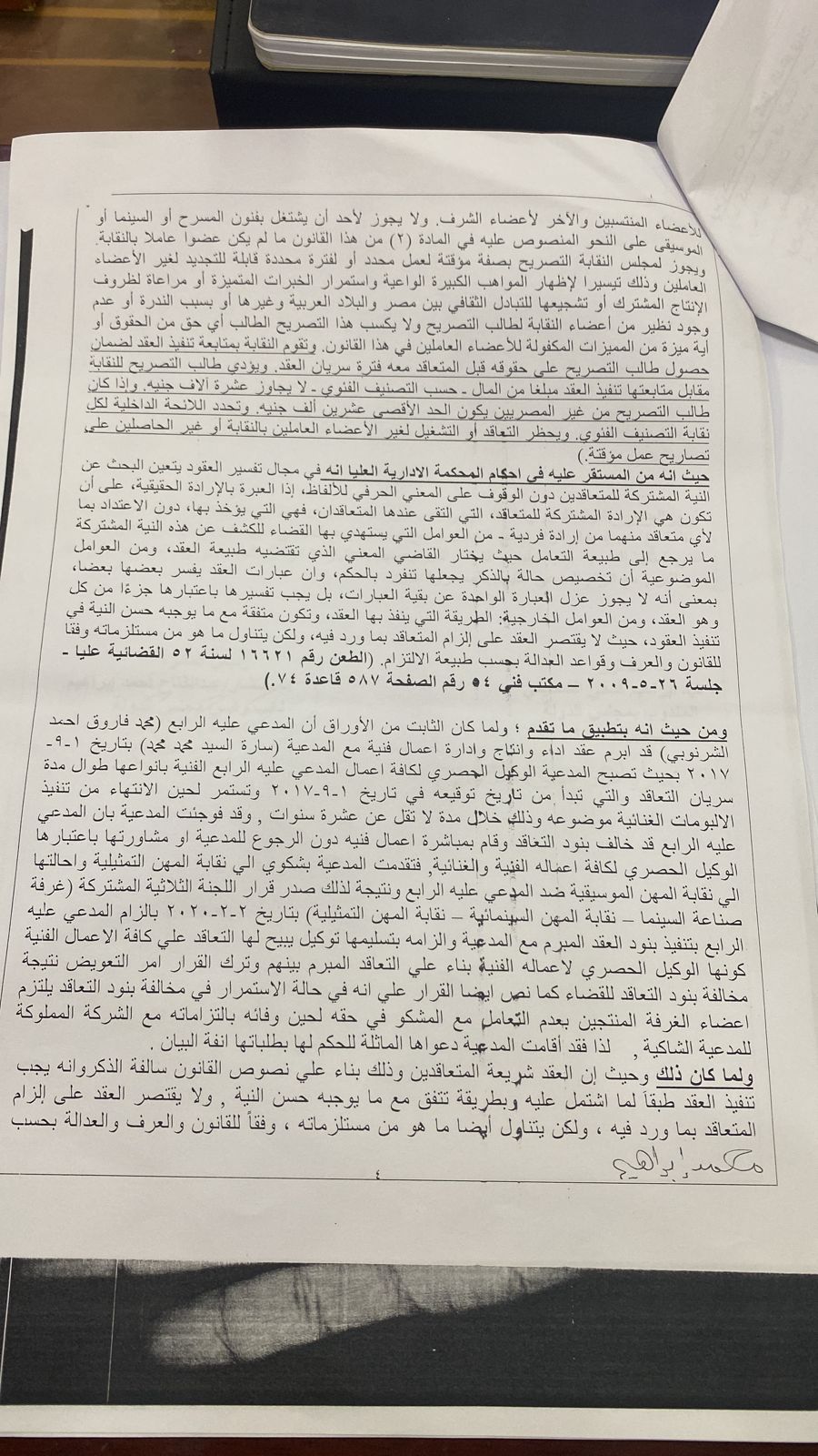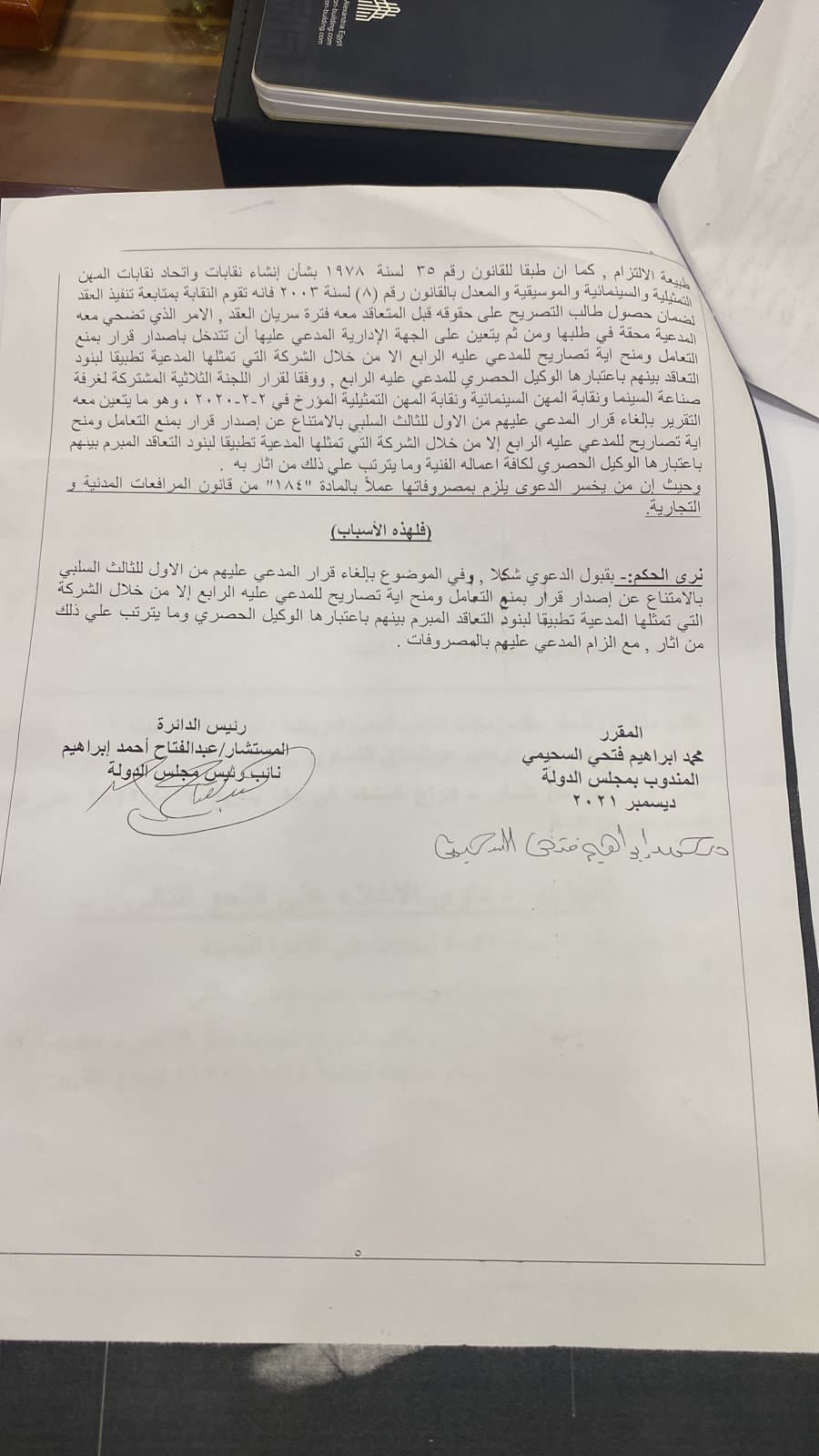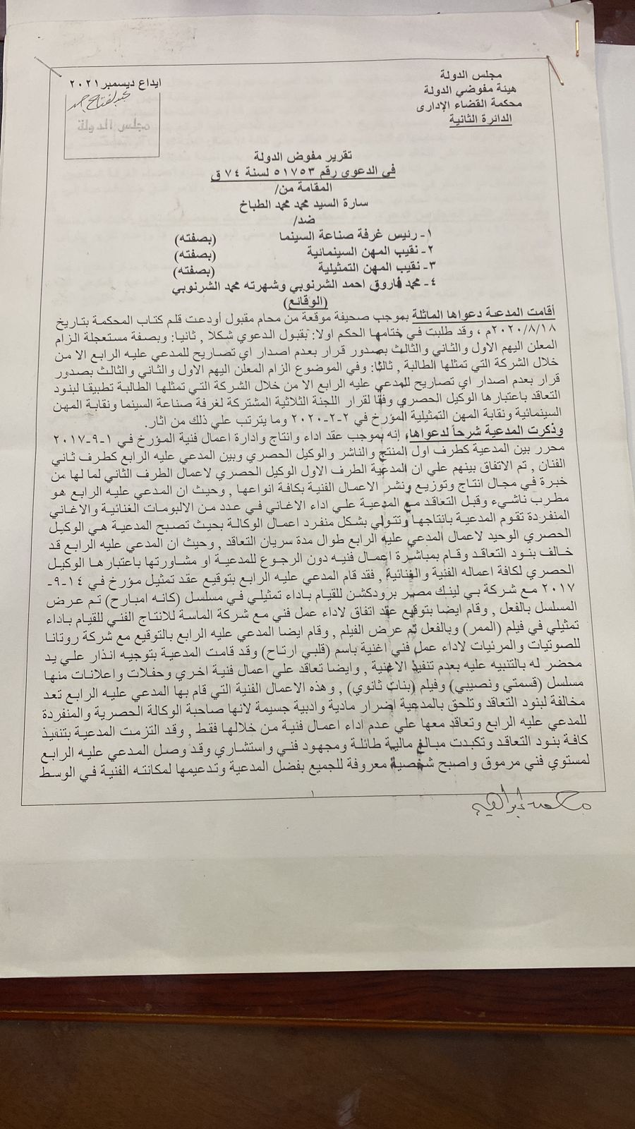 واستمرت سارة الطباخ: بالإضافة أن الحكم المنوه عنه هو حكم شكلي م يتطرق للموضوع ومرفق تقرير هيئة مفوضي الدولة الذي أكد إلزام النقابات اصدار قرار بمنع التعامل ومنع أيه تصاريح للمدعي عليه الرابع ( محمد شرنوبي ) إلا من خلال الشركة التي تمثلها المدعية تطبيقا لبنود التعاقد المبرم تهم بإعتبارها الوكيل الحصري.