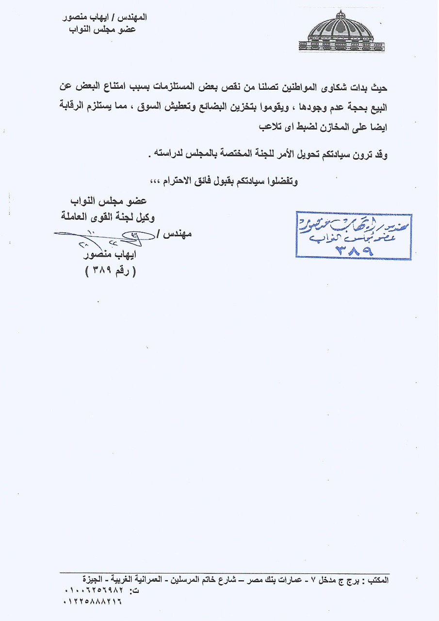 وأشار النائب الى وصول عدد من شكاوى المواطنين من نقص بعض المنتجات بسبب امتناع بعض التجارعن البيع بحجة عدم وجودها ، مع قيامهم بتخزينها وتعطيش السوق ، مما يستلزم الرقابة أيضا على المخازن لضبط أي تلاعب.